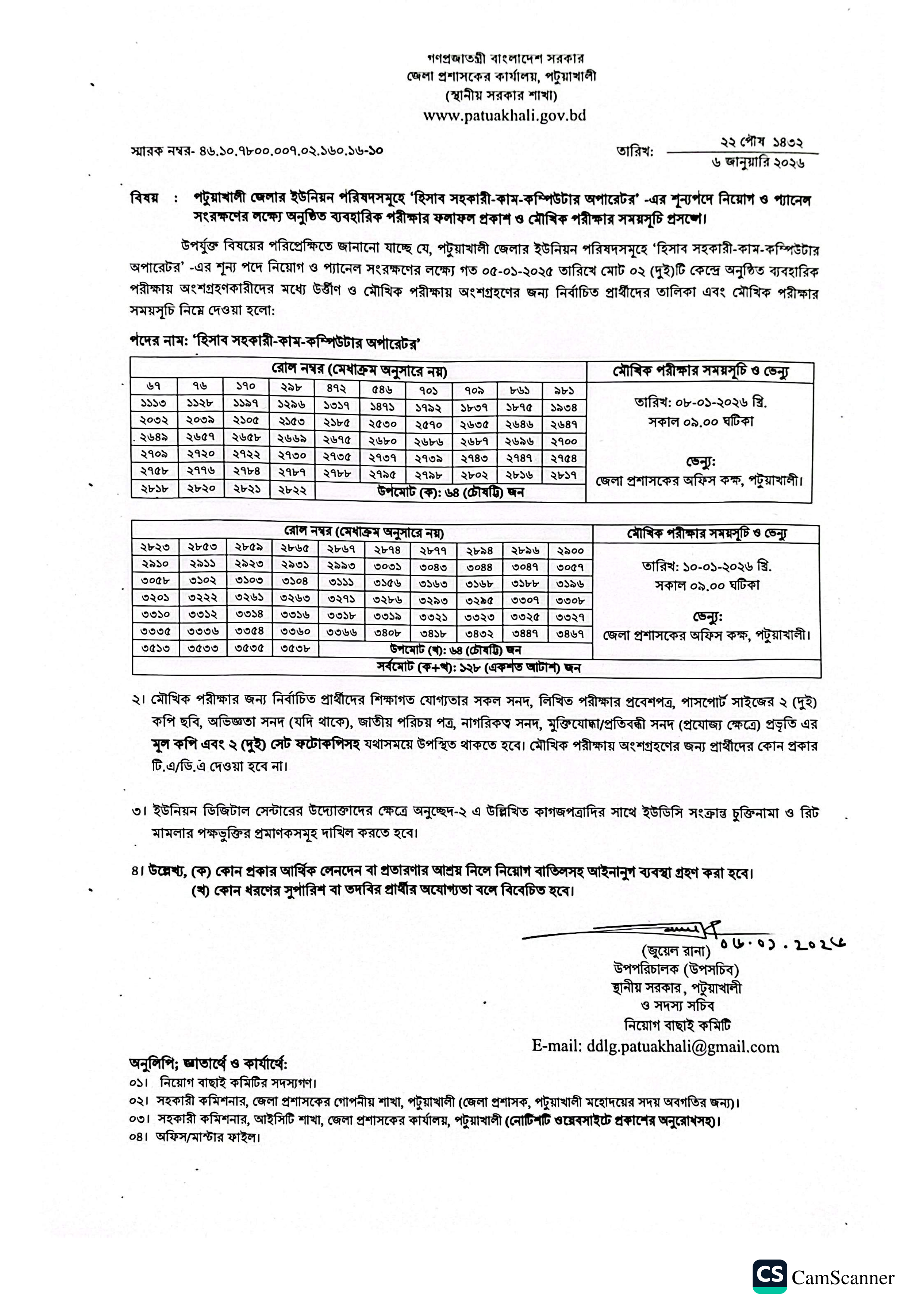 পরীক্ষার স্থান: জেলা প্রশাসকের অফিস কক্ষ, পটুয়াখালী।