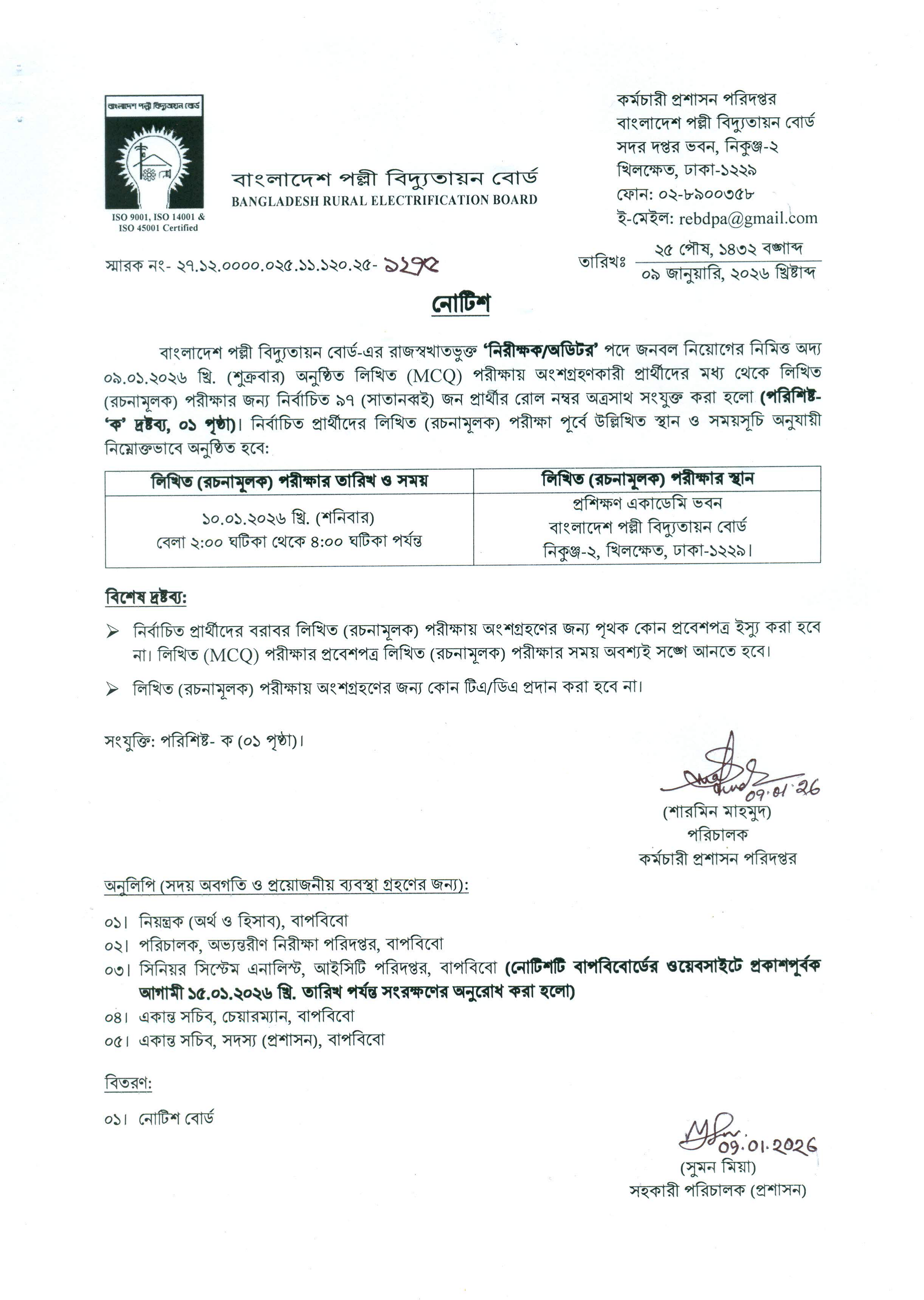 পরীক্ষার স্থান: প্রশিক্ষণ একাডেমি ভবন, বাংলাদেশ পল্লী বিদ্যুতায়ন বোর্ড, নিকুঞ্জ-২, খিলক্ষেত, ঢাকা-১২২৯।
