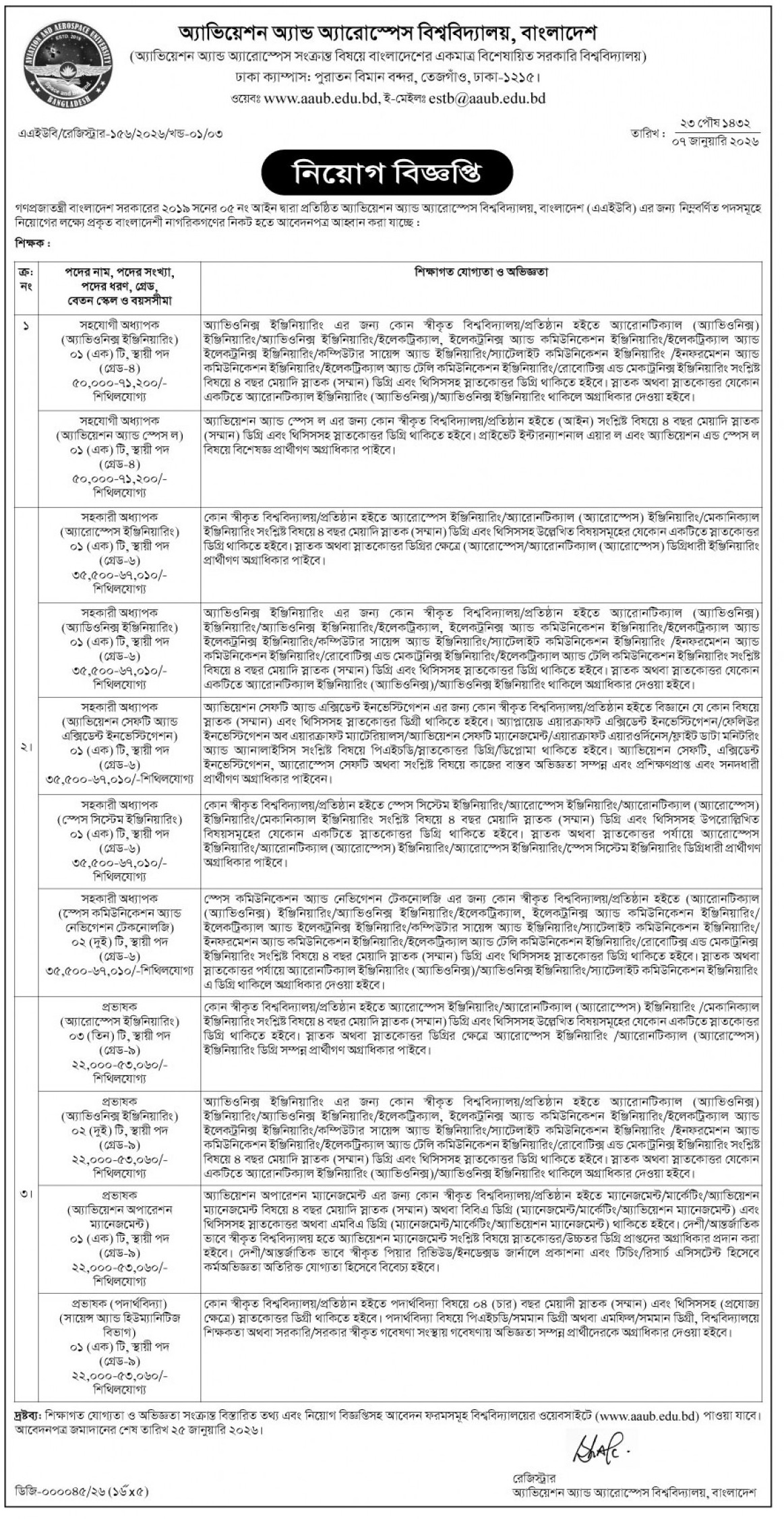 | ১ | সহযোগী অধ্যাপক (অ্যাভিয়নিক্স / অ্যাভিয়েশন অ্যান্ড স্পেস ল) - ০২টি | ৫০,০০০-৭১,২০০/- (গ্রেড-৪) | সংশ্লিষ্ট বিষয়ে ৪ বছর মেয়াদী স্নাতক ও স্নাতকোত্তর। উচ্চতর ডিগ্রিধারীদের অগ্রাধিকার। |