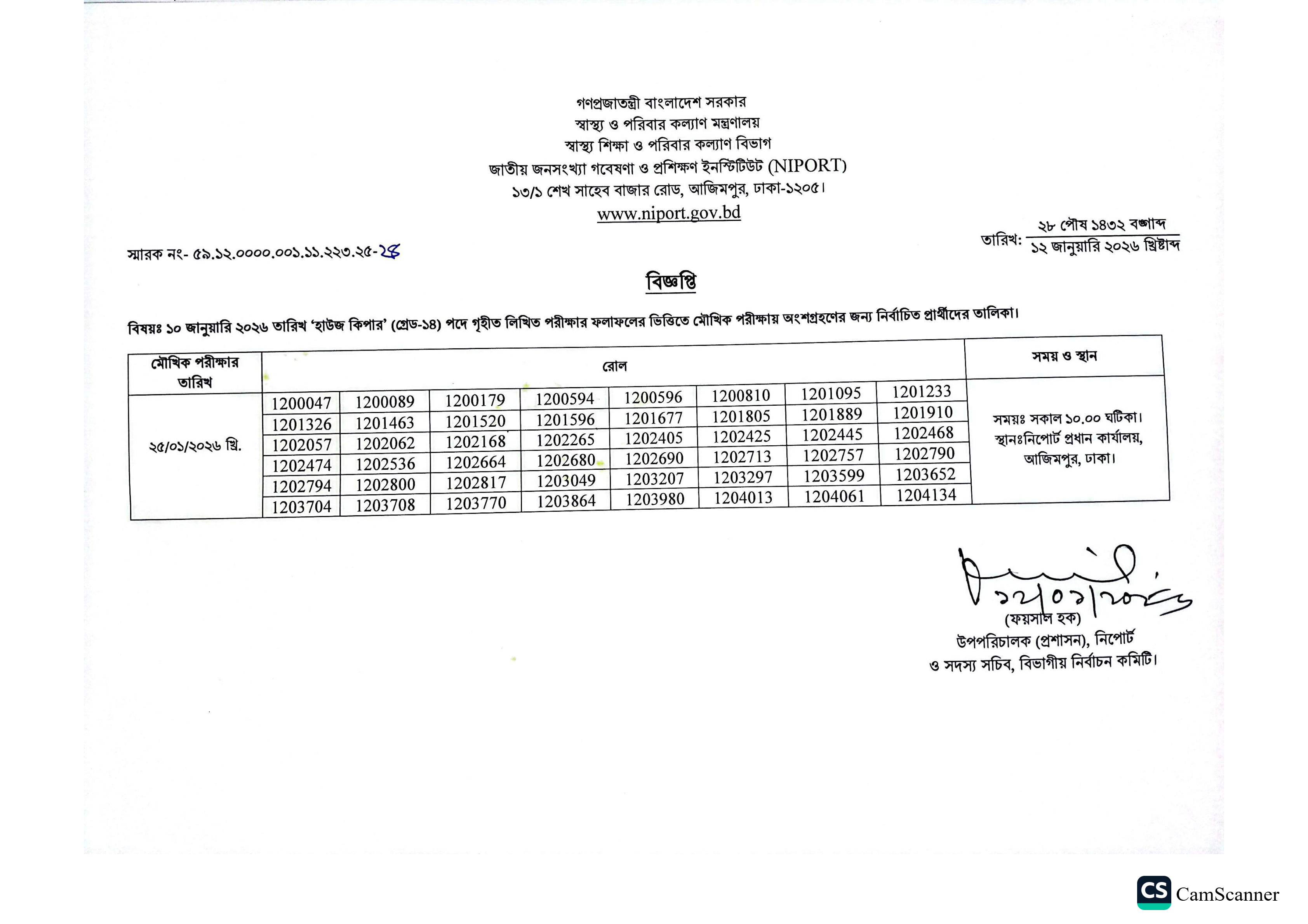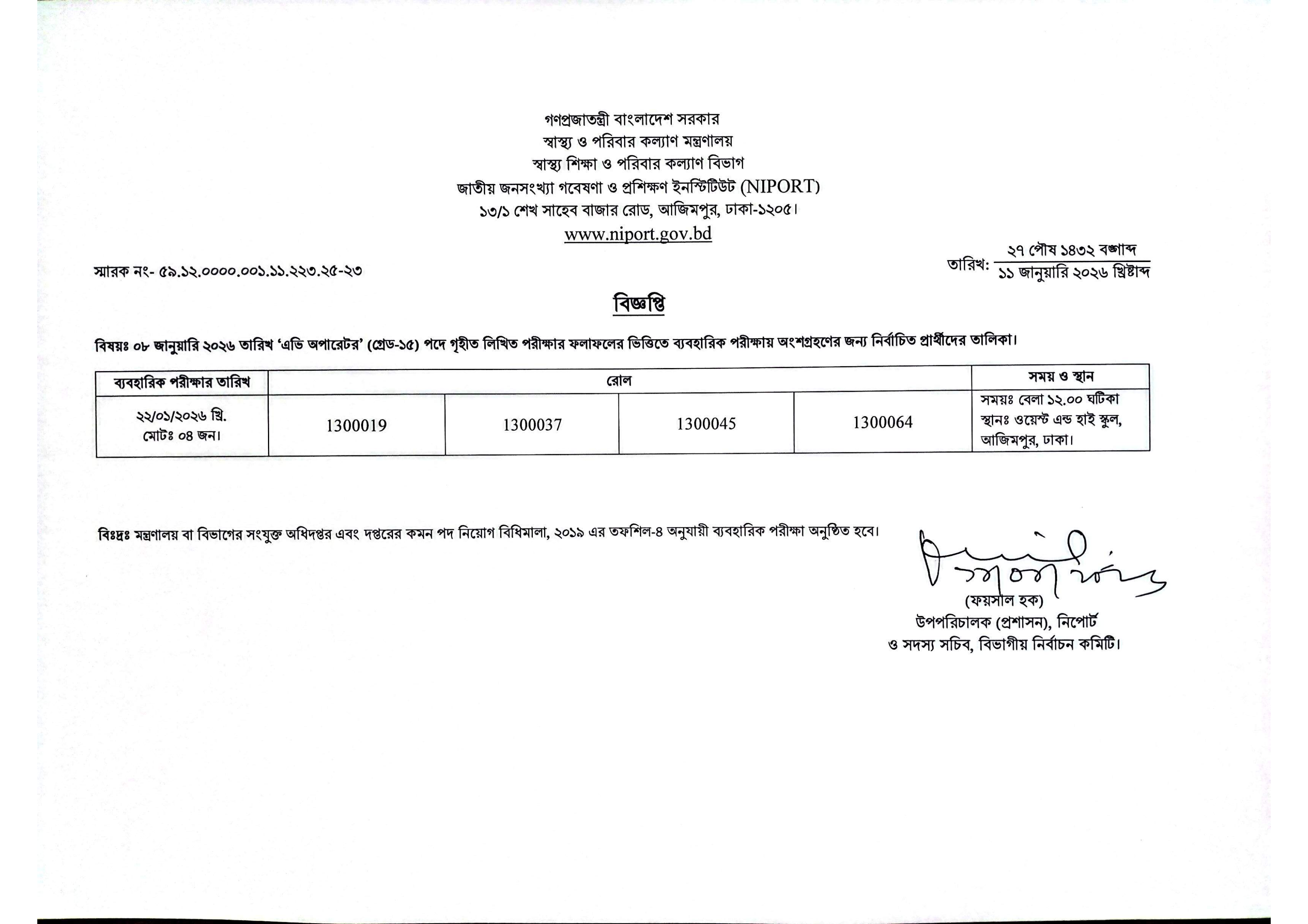 পরীক্ষার স্থান: জাতীয় জনসংখ্যা গবেষণা ও প্রশিক্ষণ ইনস্টিটিউট (নিপোর্ট), ১৩/১ শেখ সাহেব বাজার রোড, আজিমপুর, ঢাকা-১২০৫।