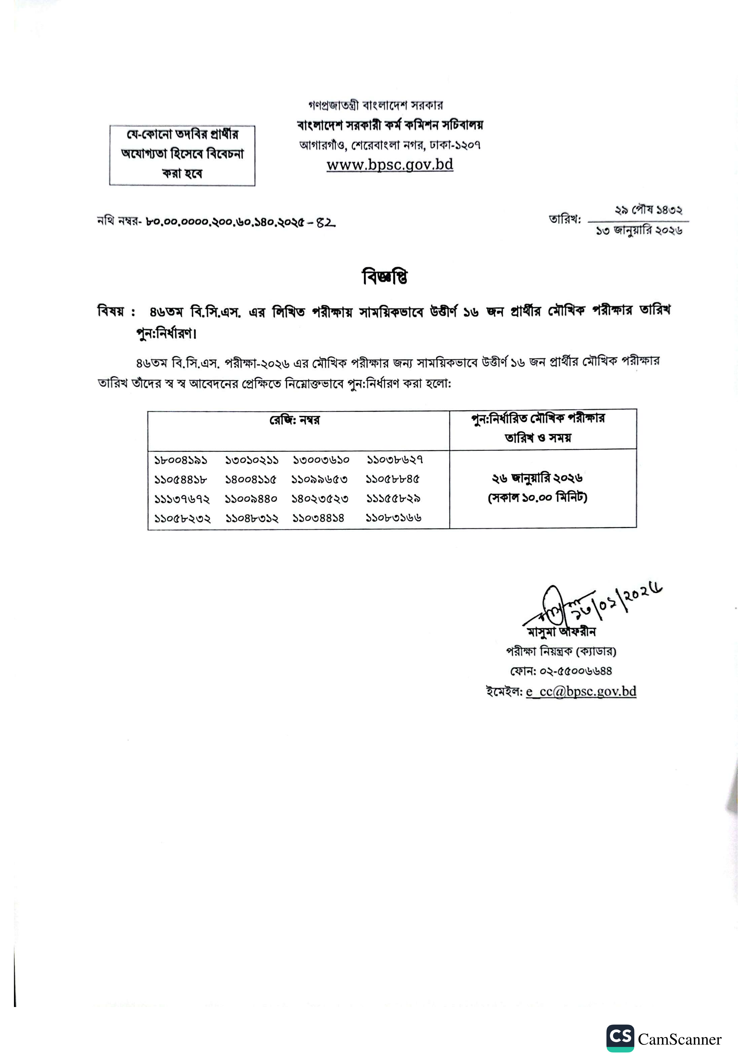 ৪৬তম বিসিএস-এর লিখিত পরীক্ষায় সাময়িকভাবে উত্তীর্ণ ১৬ জন প্রার্থীর আবেদনের প্রেক্ষিতে তাদের মৌখিক পরীক্ষার (ভাইভা) তারিখ পুন:নির্ধারণ করা হয়েছে। প্রার্থীদের স্ব-স্ব আবেদনের প্রেক্ষিতে কমিশন এই নতুন তারিখ নির্ধারণের সিদ্ধান্ত নিয়েছে।