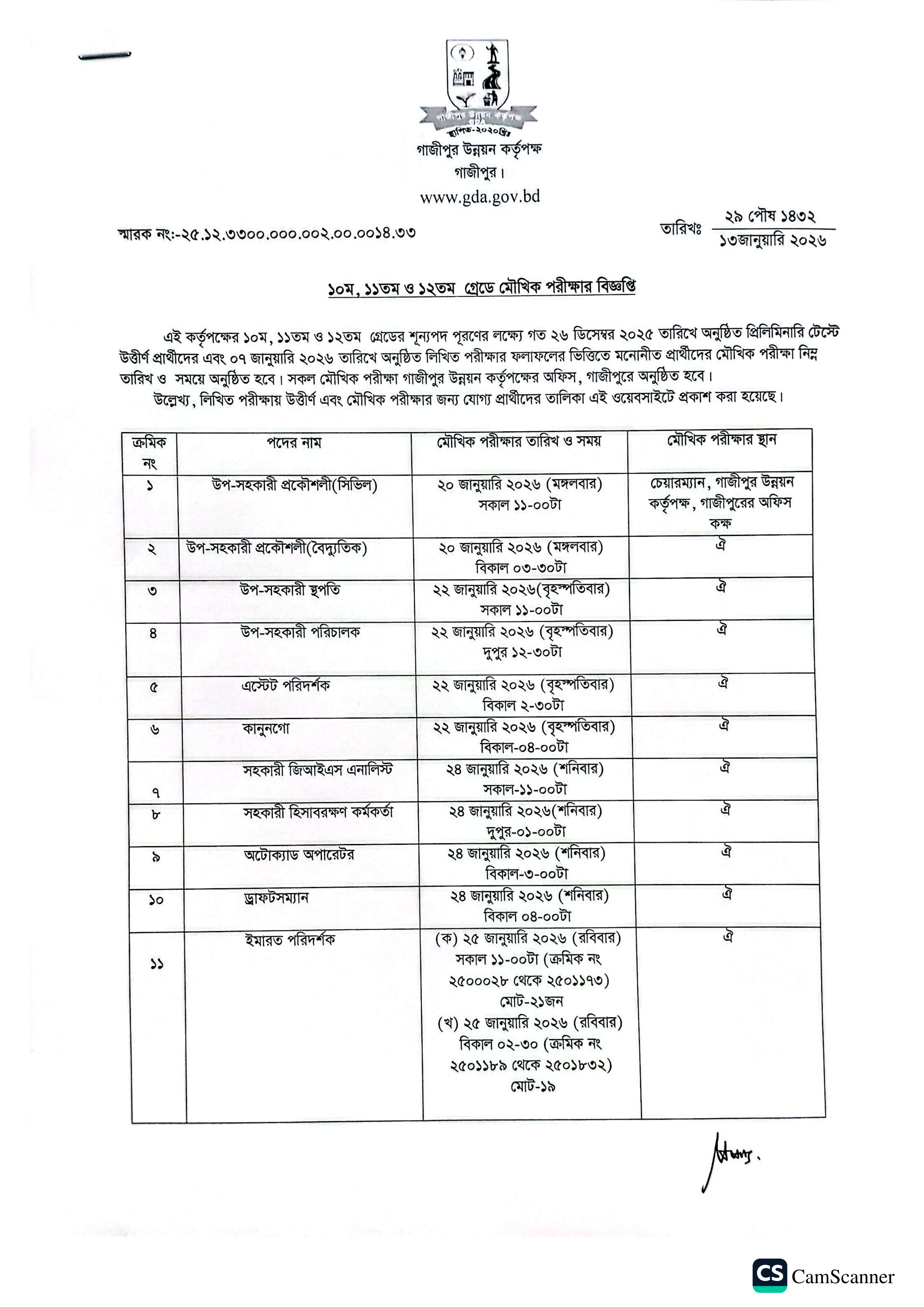 গাজীপুর উন্নয়ন কর্তৃপক্ষের ১০ম, ১১তম ও ১২তম গ্রেডের বিভিন্ন শূন্যপদে জনবল নিয়োগের লক্ষ্যে অনুষ্ঠিত লিখিত পরীক্ষায় উত্তীর্ণ প্রার্থীদের মৌখিক পরীক্ষার সময়সূচী প্রকাশ করা হয়েছে। গত ০৭ জানুয়ারি ২০২৬ তারিখে অনুষ্ঠিত লিখিত পরীক্ষার ফলাফলের ভিত্তিতে প্রার্থীদের মৌখিক পরীক্ষার জন্য মনোনীত করা হয়েছে।