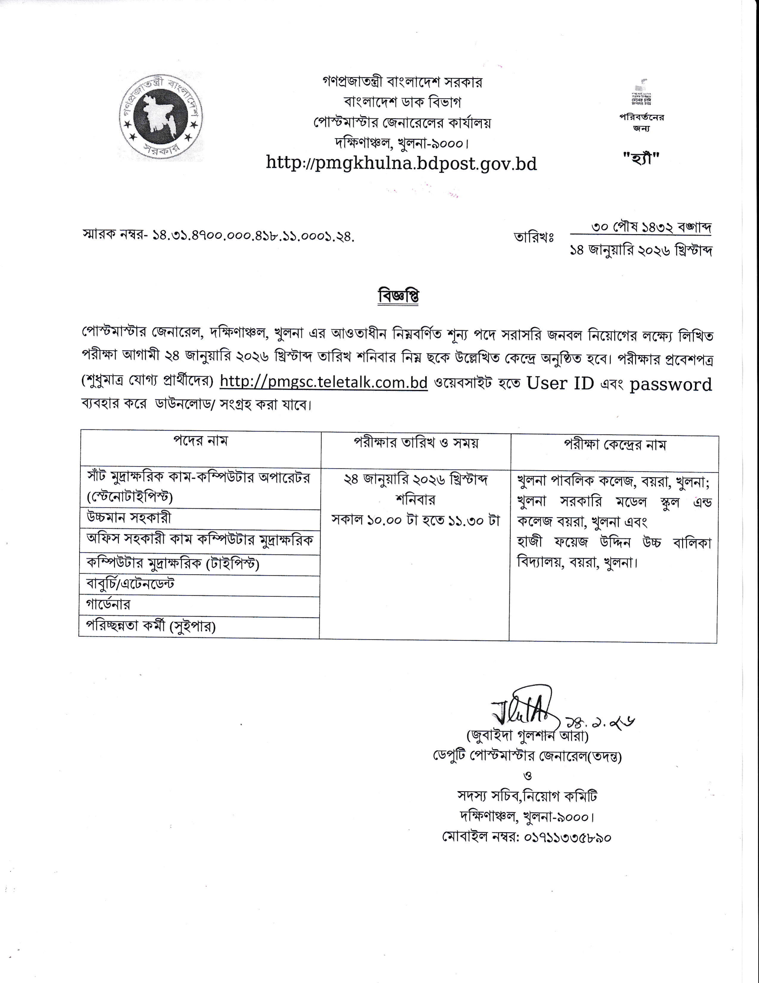বাংলাদেশ ডাক বিভাগ, দক্ষিণাঞ্চল, খুলনা-এর আওতাধীন বিভিন্ন শূন্য পদে সরাসরি জনবল নিয়োগের লক্ষ্যে লিখিত পরীক্ষার তারিখ, সময় ও কেন্দ্র সংক্রান্ত বিজ্ঞপ্তি প্রকাশ করা হয়েছে।
