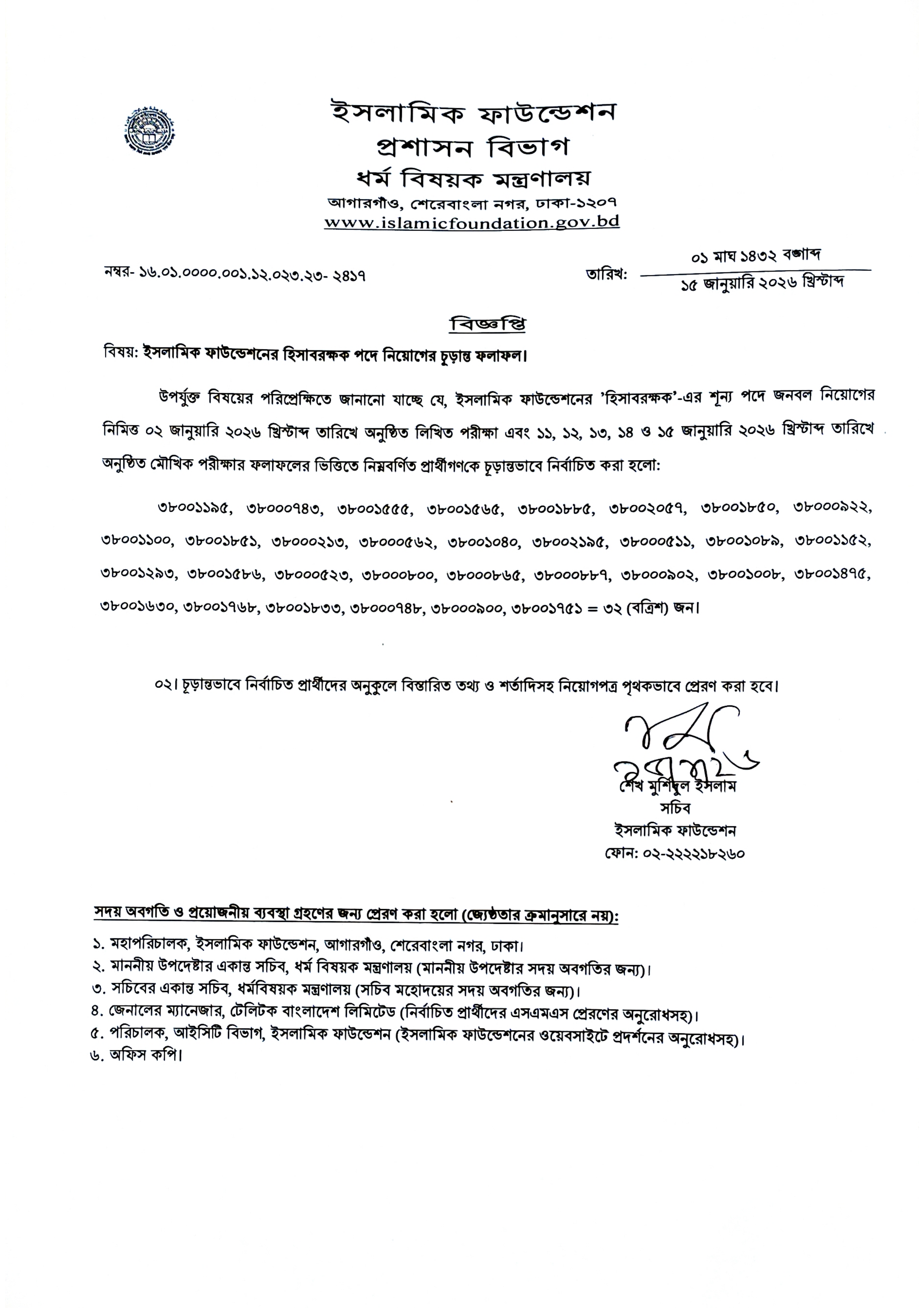 ধর্ম বিষয়ক মন্ত্রণালয়ের অধীনস্থ ইসলামিক ফাউন্ডেশনের নিয়োগ পরীক্ষার চূড়ান্ত ফলাফল প্রকাশ করা হয়েছে। গত ০২ জানুয়ারি ২০২৬ তারিখে অনুষ্ঠিত লিখিত পরীক্ষা এবং ১১ থেকে ১৫ জানুয়ারি ২০২৬ তারিখ পর্যন্ত অনুষ্ঠিত মৌখিক পরীক্ষার ফলাফলের ভিত্তিতে এই ফলাফল প্রকাশ করা হয়।