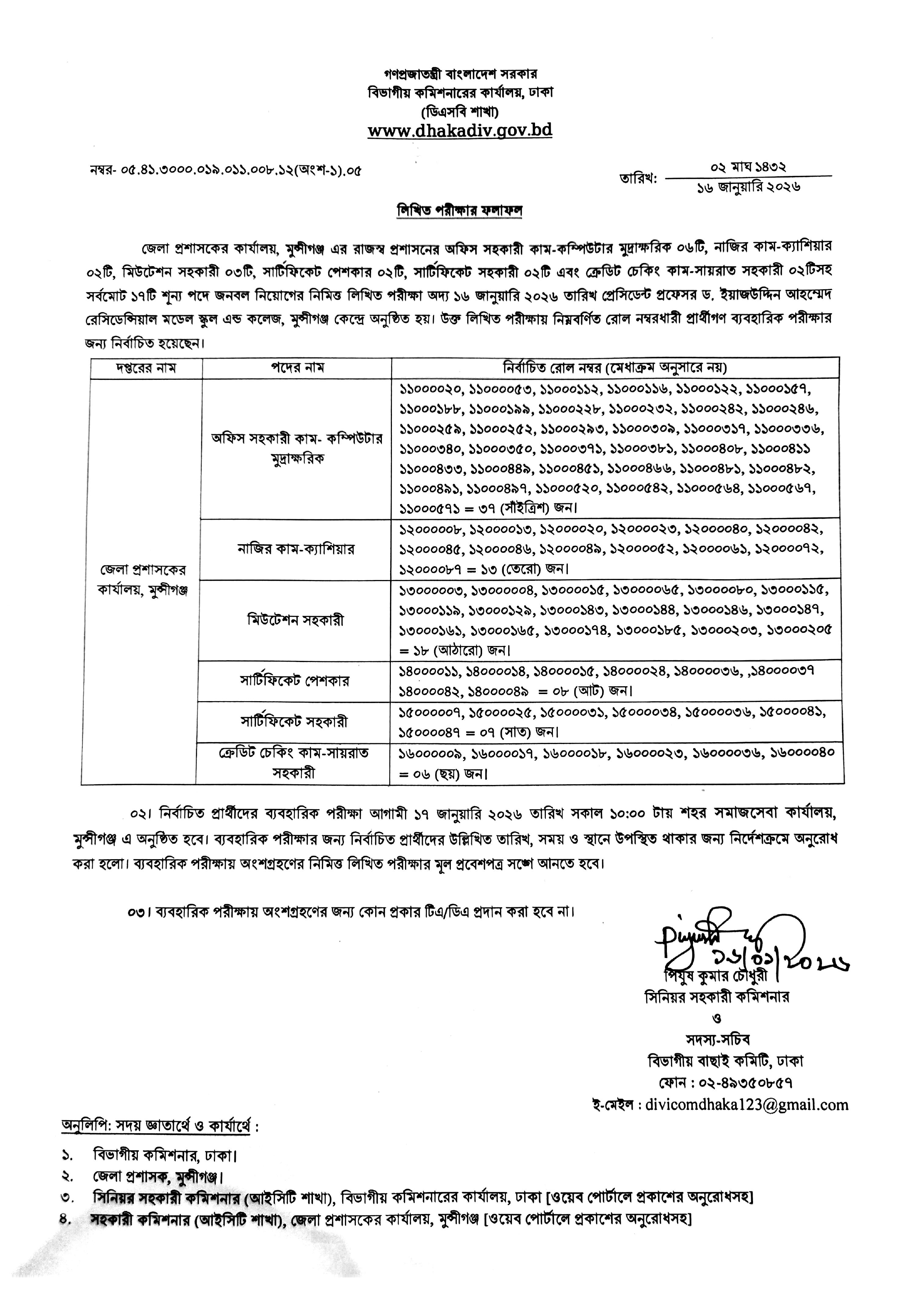 জেলা প্রশাসকের কার্যালয়, মুন্সীগঞ্জ-এর রাজস্ব প্রশাসনের ১৭টি শূন্য পদে জনবল নিয়োগের জন্য অনুষ্ঠিত লিখিত পরীক্ষার ফলাফল প্রকাশ করা হয়েছে। লিখিত পরীক্ষায় উত্তীর্ণ প্রার্থীদের পরবর্তী ধাপ হিসেবে ব্যবহারিক পরীক্ষায় অংশগ্রহণের জন্য আহ্বান জানানো হয়েছে।