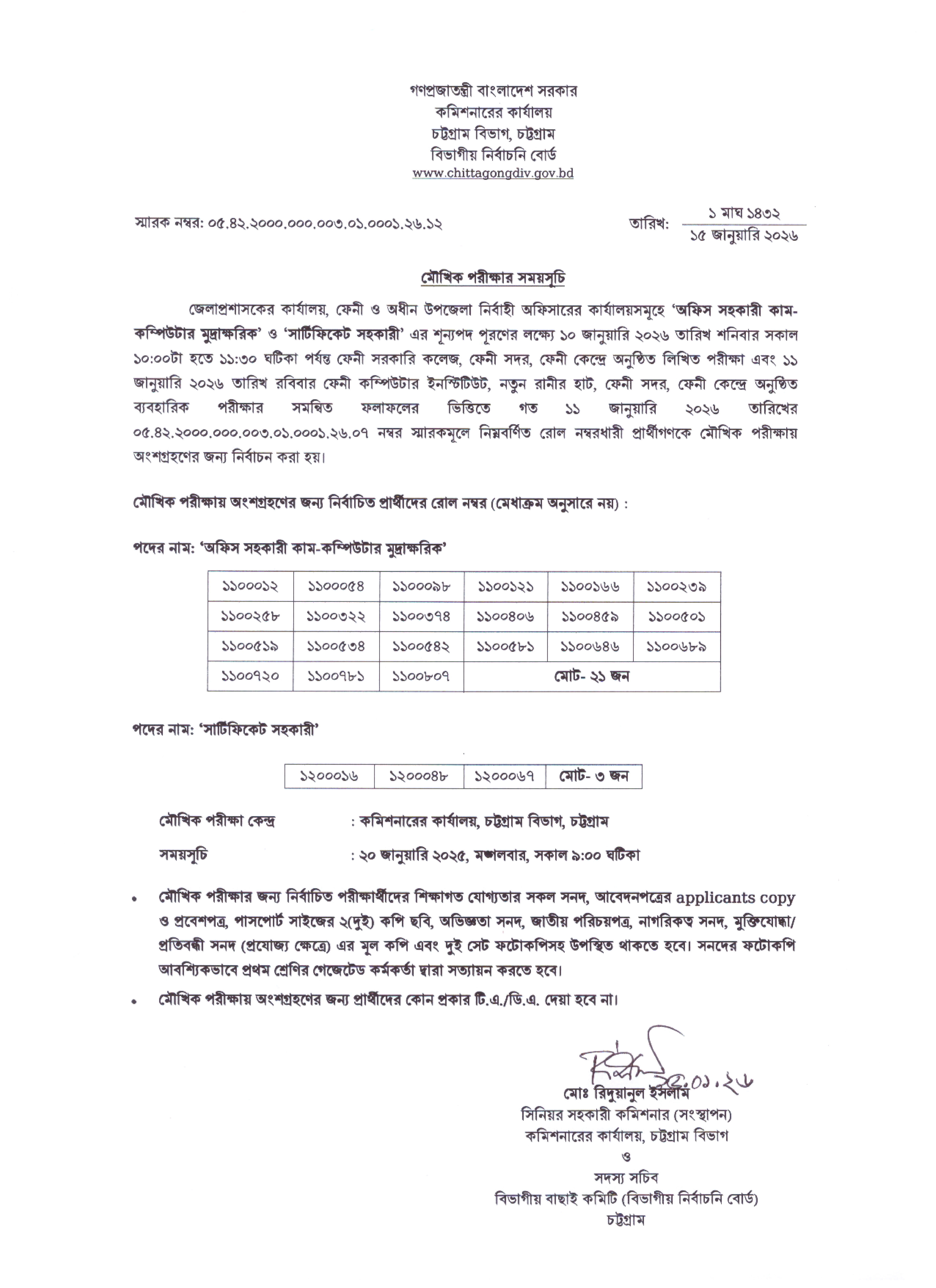 চট্টগ্রাম বিভাগীয় কমিশনারের কার্যালয় ও ফেনী জেলা প্রশাসকের কার্যালয়ের অধীন বিভিন্ন পদের লিখিত ও ব্যবহারিক পরীক্ষার ফলাফলের ভিত্তিতে উত্তীর্ণ প্রার্থীদের মৌখিক পরীক্ষার সময়সূচি ঘোষণা করা হয়েছে।