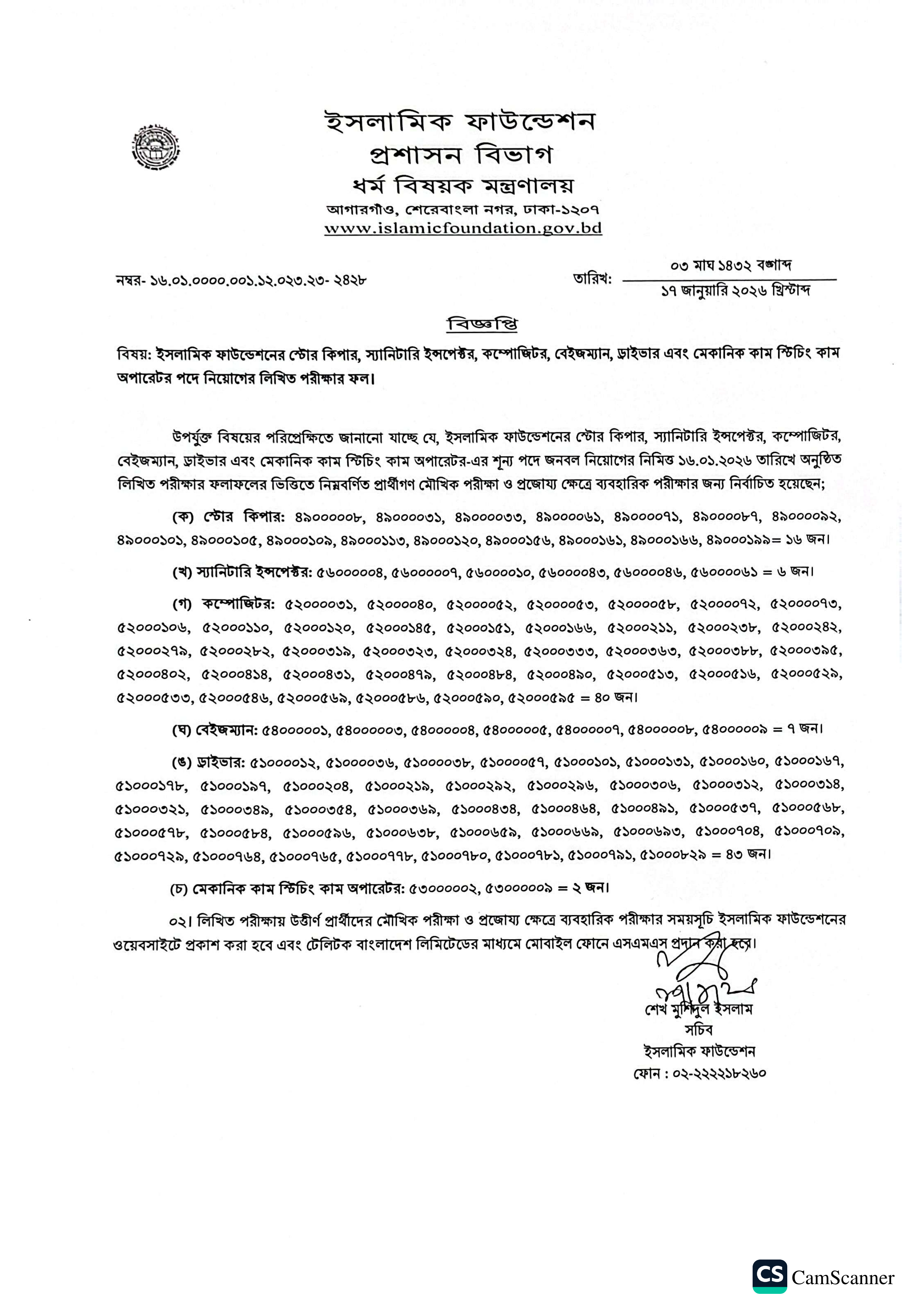 ইসলামিক ফাউন্ডেশনের বিভিন্ন শূন্য পদে জনবল নিয়োগের লক্ষ্যে অনুষ্ঠিত লিখিত পরীক্ষার ফলাফল প্রকাশ করা হয়েছে। গত ১৬ জানুয়ারি ২০২৬ তারিখে অনুষ্ঠিত লিখিত পরীক্ষার ভিত্তিতে উত্তীর্ণ প্রার্থীদের তালিকা প্রকাশ করেছে কর্তৃপক্ষ।