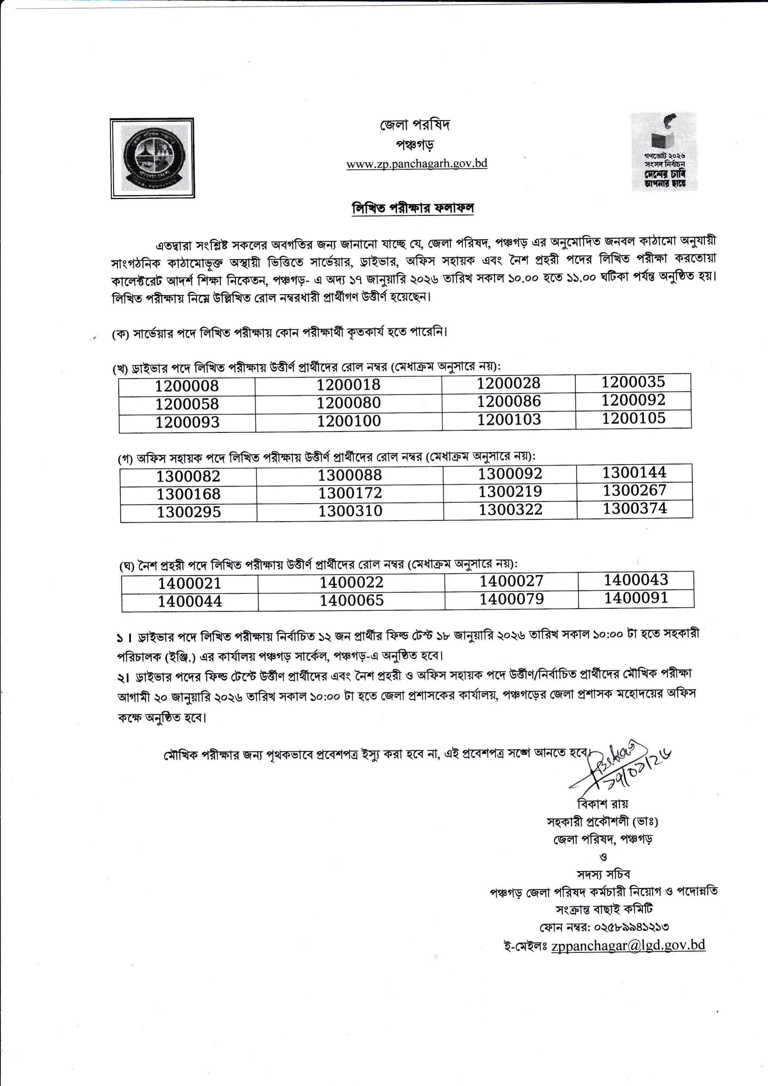 ২. মৌখিক পরীক্ষা: ড্রাইভার (ফিল্ড টেস্টে উত্তীর্ণ), অফিস সহায়ক এবং নৈশ প্রহরী পদের প্রার্থীদের মৌখিক পরীক্ষা আগামী ২০ জানুয়ারি ২০২৬ তারিখ সকাল ১০:০০ টা হতে জেলা প্রশাসকের কার্যালয়, পঞ্চগড়ে অনুষ্ঠিত হবে।