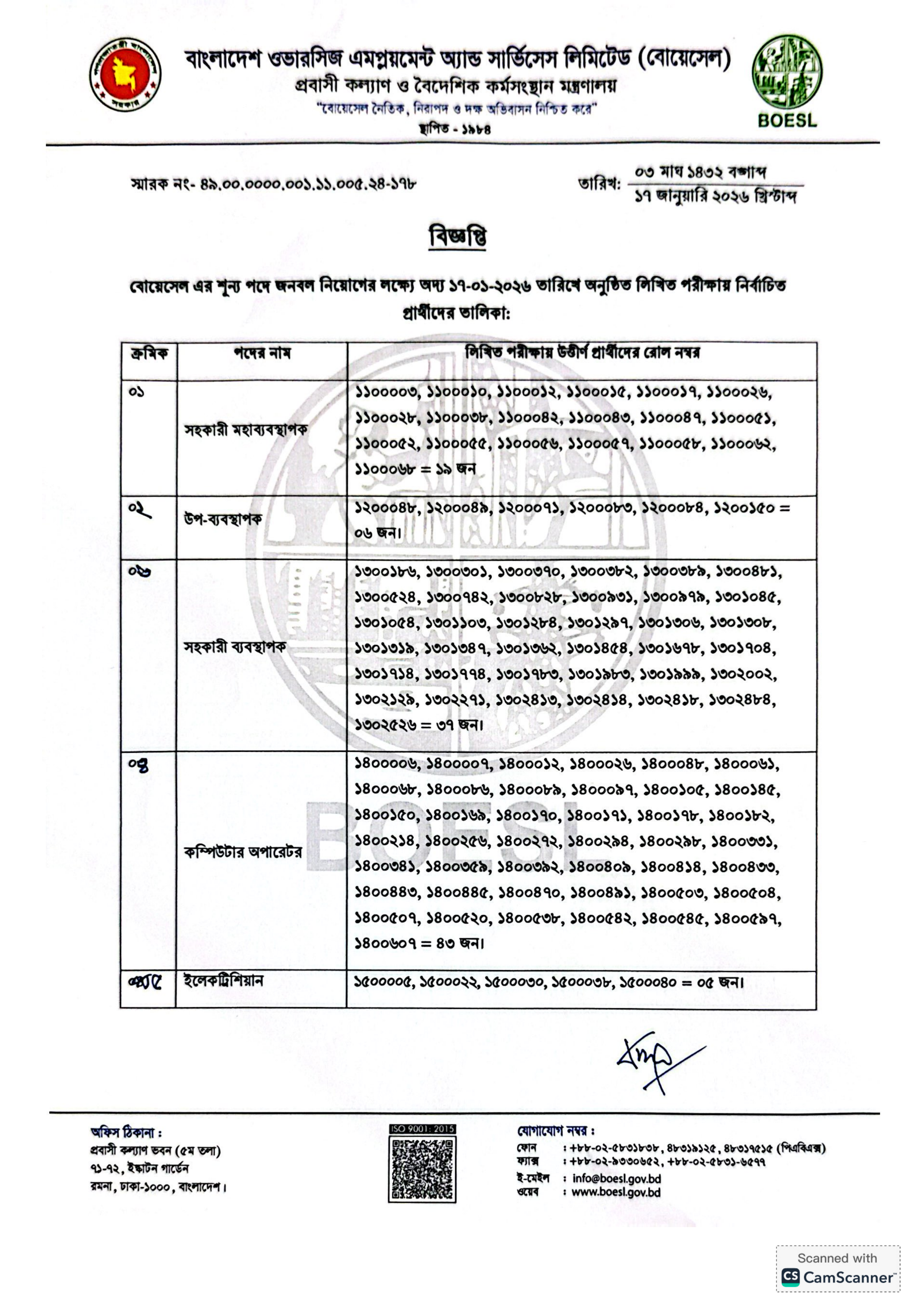 বাংলাদেশ ওভারসিজ এমপ্লয়মেন্ট অ্যান্ড সার্ভিসেস লিমিটেড (বোয়েসেল)-এর বিভিন্ন শূন্য পদে জনবল নিয়োগের লক্ষ্যে অনুষ্ঠিত লিখিত পরীক্ষার ফলাফল প্রকাশ করা হয়েছে। লিখিত পরীক্ষায় উত্তীর্ণ প্রার্থীদের জন্য পরবর্তী মৌখিক ও ব্যবহারিক পরীক্ষার সময়সূচিও ঘোষণা করা হয়েছে।