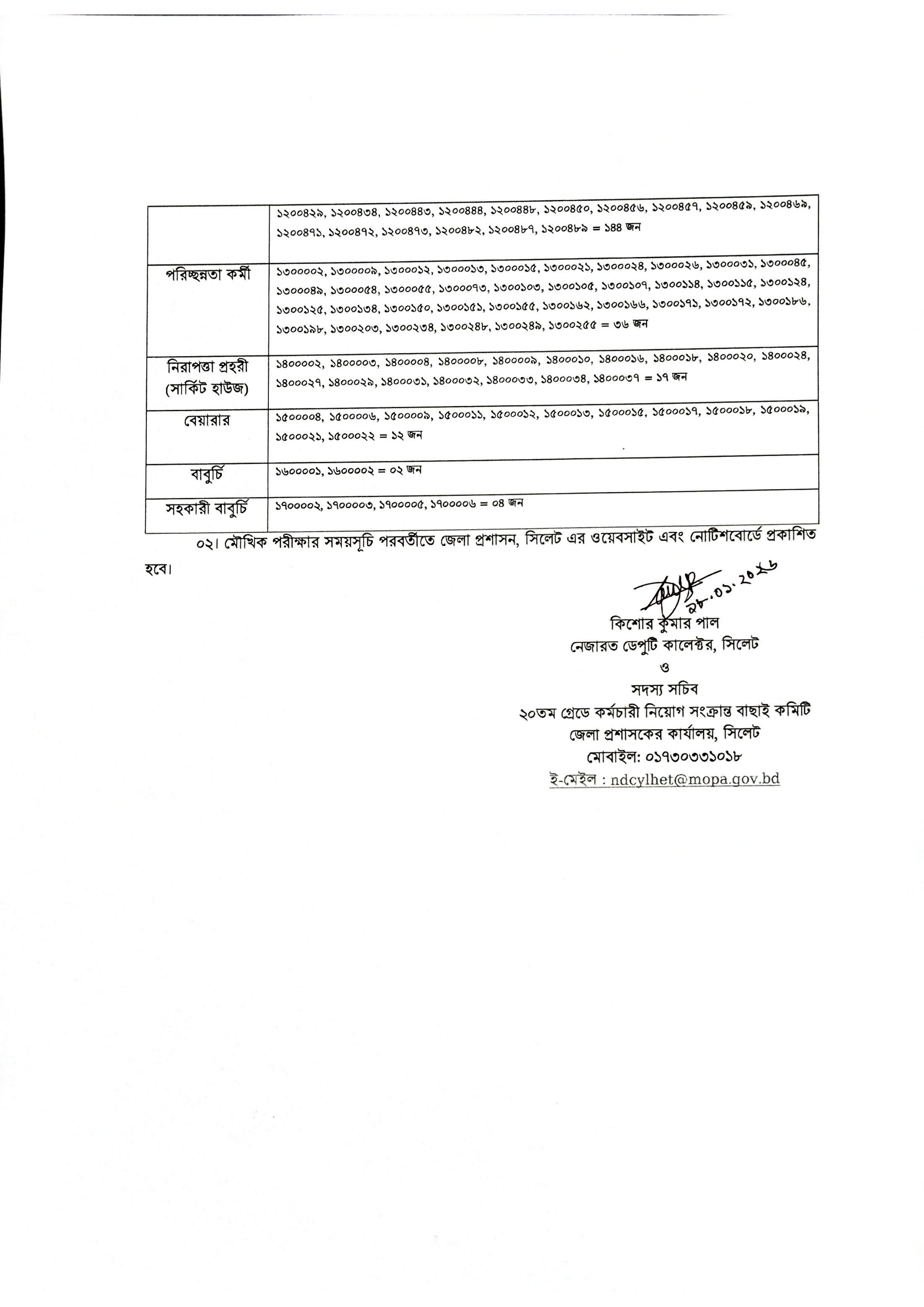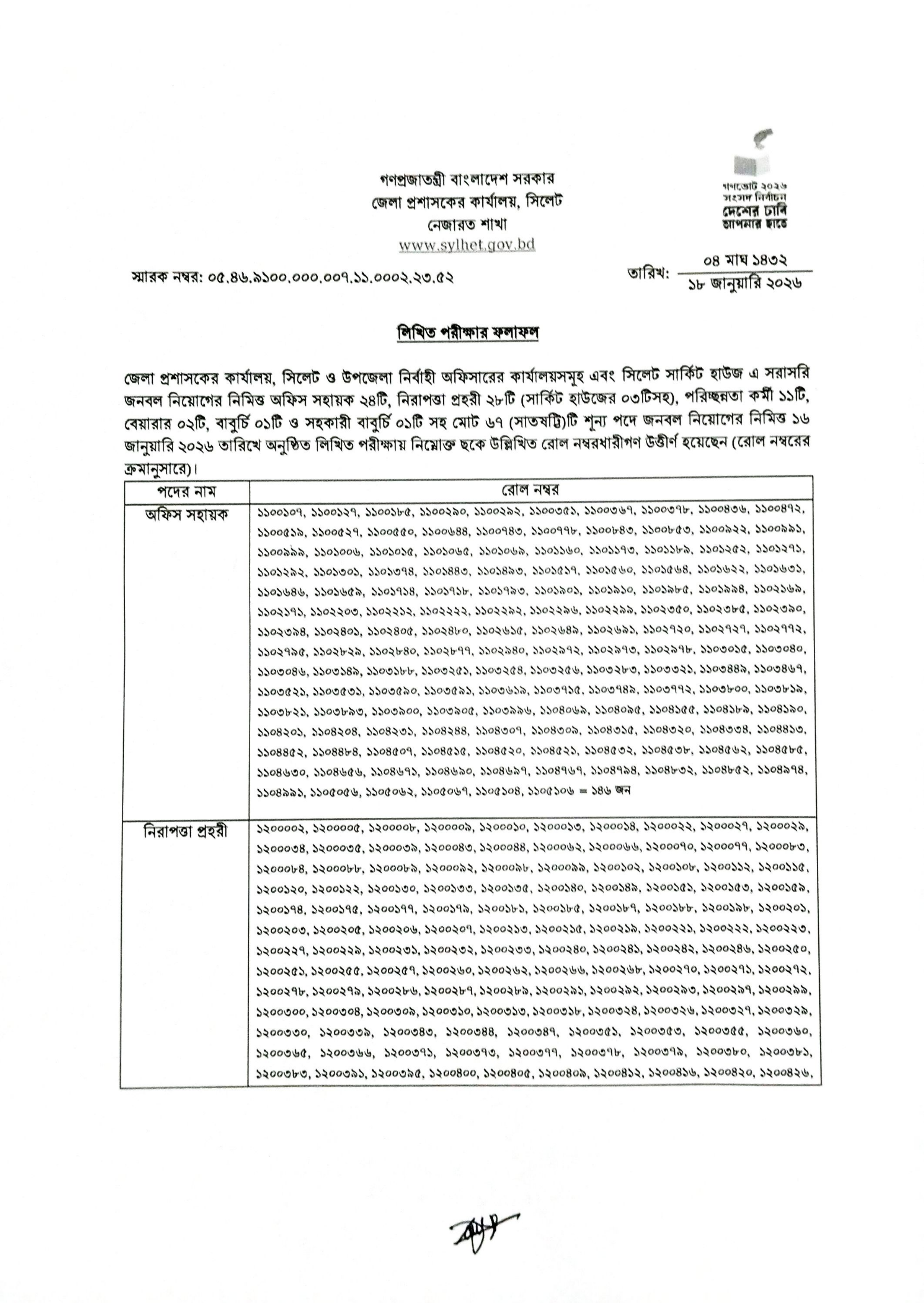 সিলেট জেলা প্রশাসকের কার্যালয়, উপজেলা নির্বাহী অফিসারের কার্যালয়সমূহ এবং সিলেট সার্কিট হাউজে সরাসরি জনবল নিয়োগের লক্ষ্যে অনুষ্ঠিত লিখিত পরীক্ষার ফলাফল প্রকাশিত হয়েছে। গত ১৬ জানুয়ারি ২০২৬ তারিখে এই নিয়োগ পরীক্ষাটি অনুষ্ঠিত হয়।