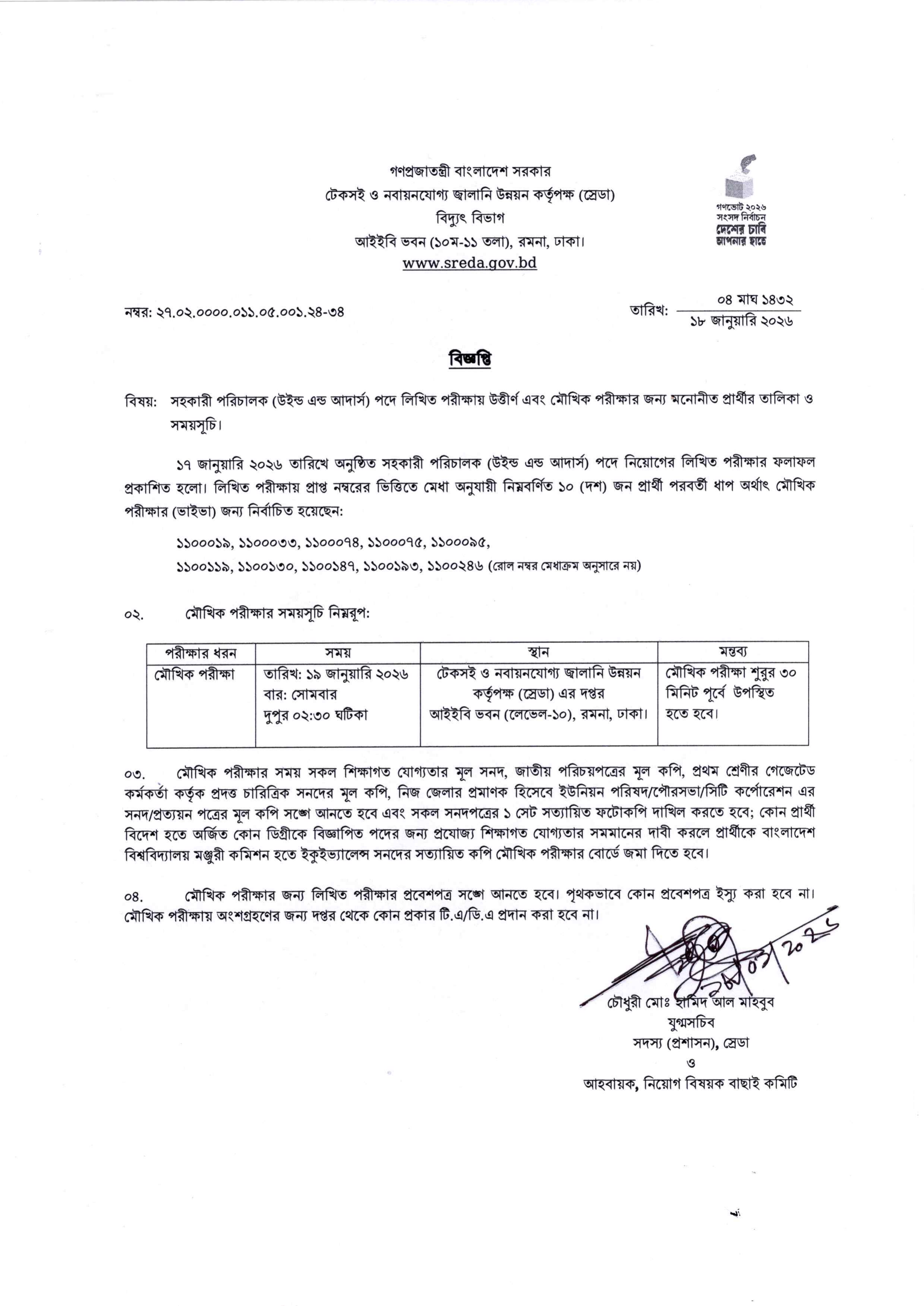 মৌখিক পরীক্ষার তারিখ: ১৯ জানুয়ারি ২০২৬ (সোমবার)