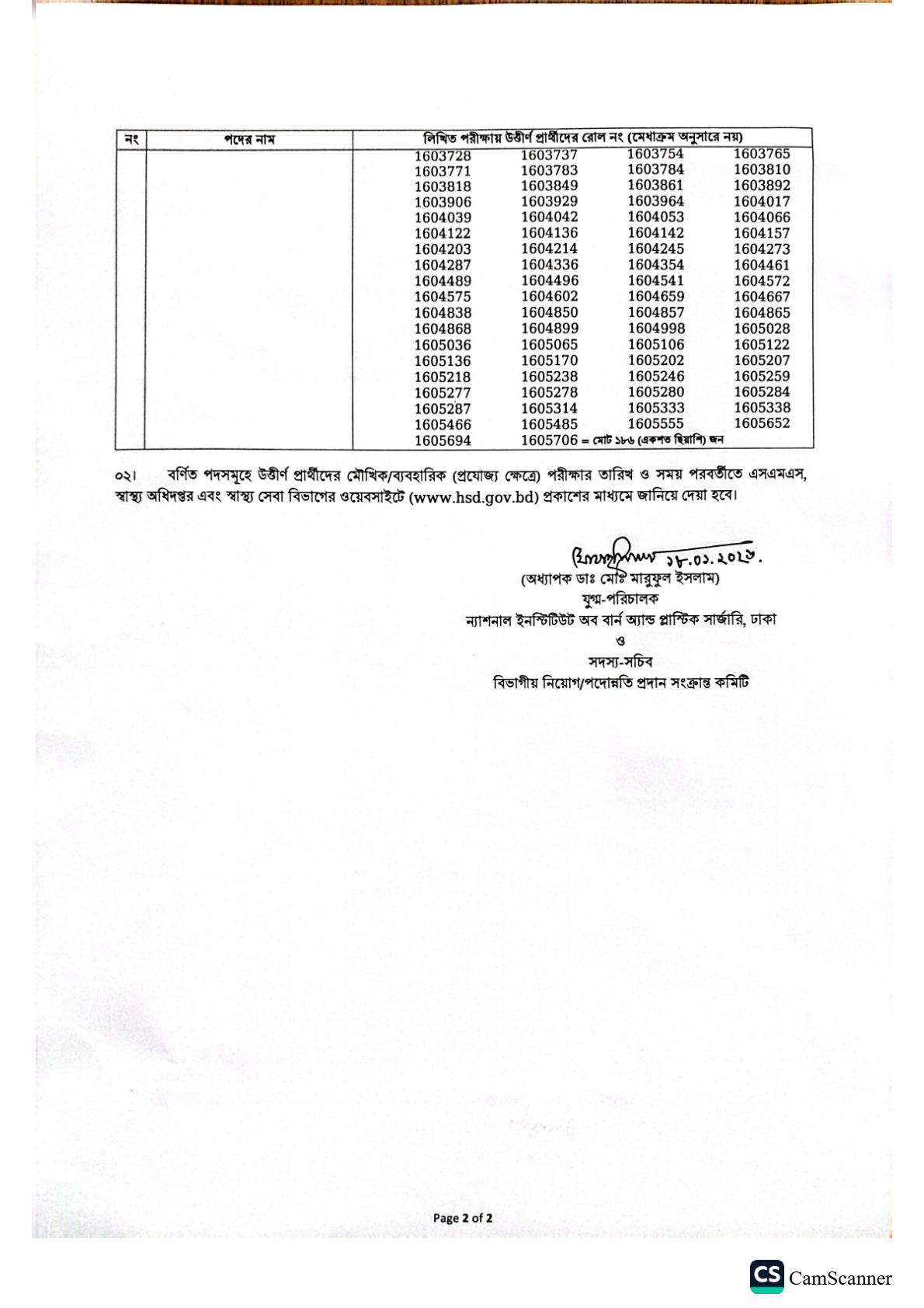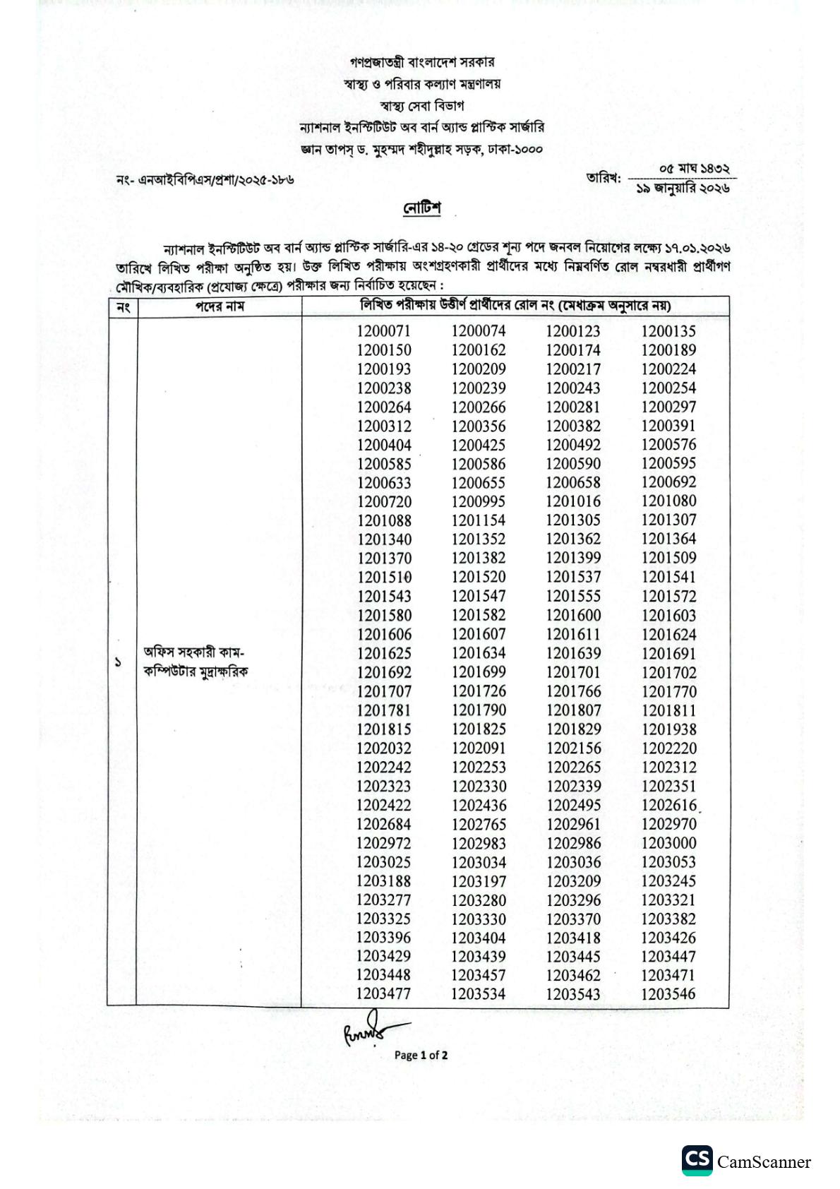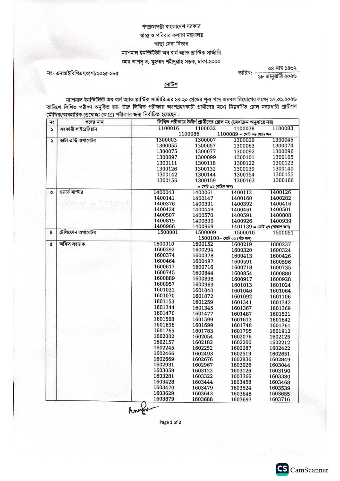 ন্যাশনাল ইনস্টিটিউট অব বার্ন আ্যান্ড প্লাস্টিক সার্জারি-এর ১৪-২০ গ্রেডের বিভিন্ন শূন্য পদে জনবল নিয়োগের লক্ষ্যে অনুষ্ঠিত লিখিত পরীক্ষার ফলাফল প্রকাশ করা হয়েছে। এই পরীক্ষায় উত্তীর্ণ প্রার্থীদের মৌখিক ও ব্যবহারিক (প্রযোজ্য ক্ষেত্রে) পরীক্ষার জন্য প্রাথমিকভাবে নির্বাচন করা হয়েছে।
