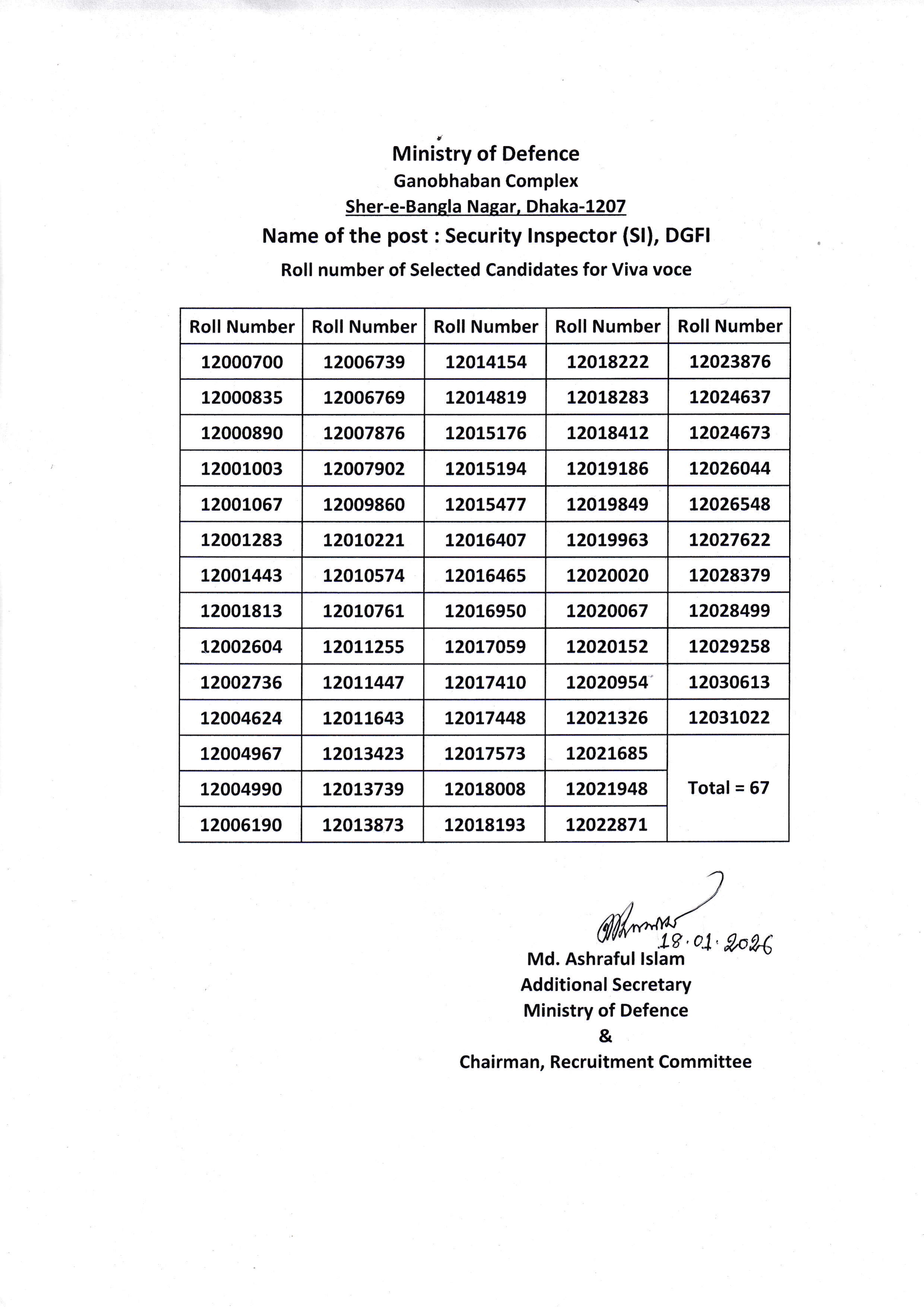 প্রতিরক্ষা মন্ত্রণালয়ের আওতাধীন ডিরেক্টরেট জেনারেল অব ফোর্সেস ইন্টেলিজেন্স (DGFI)-এর একটি পদের লিখিত পরীক্ষার ফলাফল প্রকাশিত হয়েছে। লিখিত পরীক্ষায় উত্তীর্ণ প্রার্থীদের পরবর্তী ধাপ হিসেবে মৌখিক (Viva Voce) পরীক্ষার জন্য সাময়িকভাবে নির্বাচিত করা হয়েছে।