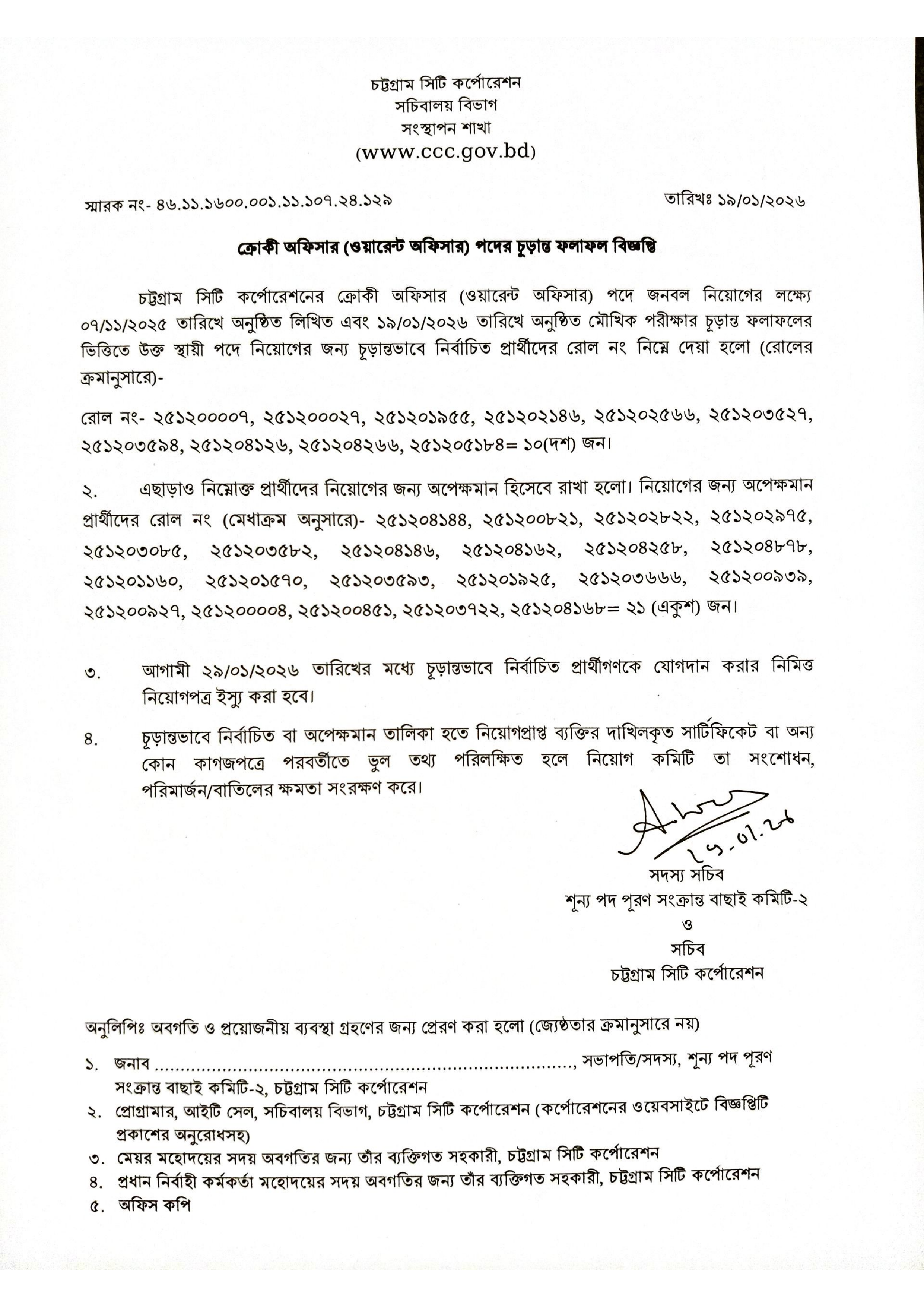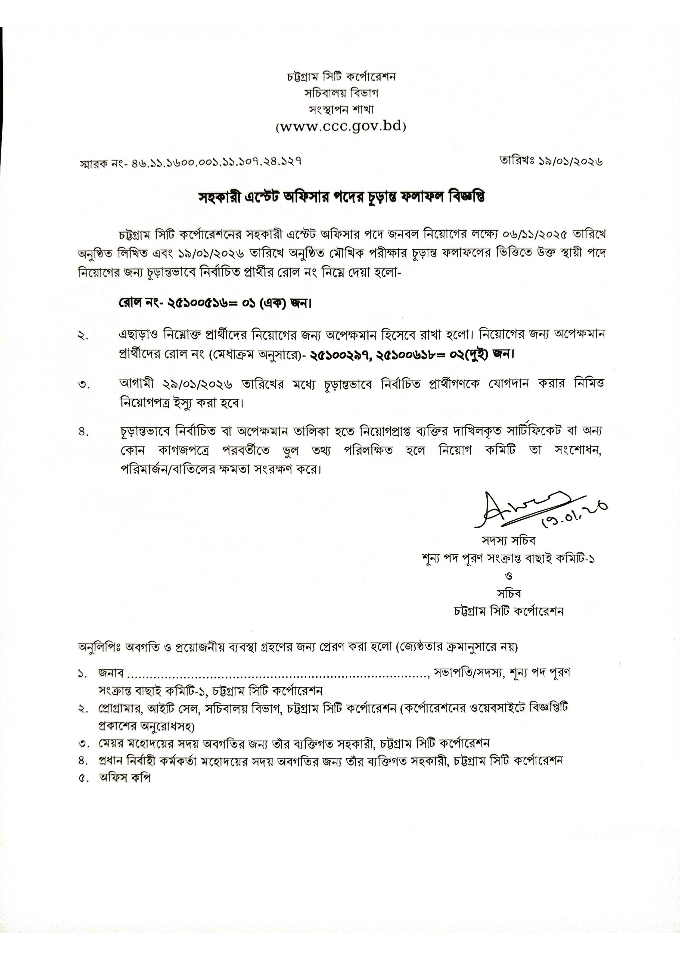 চট্টগ্রাম সিটি কর্পোরেশনের সচিবালয় বিভাগের একটি শূন্য পদে জনবল নিয়োগের লক্ষ্যে অনুষ্ঠিত লিখিত ও মৌখিক পরীক্ষার চূড়ান্ত ফলাফল প্রকাশ করা হয়েছে।