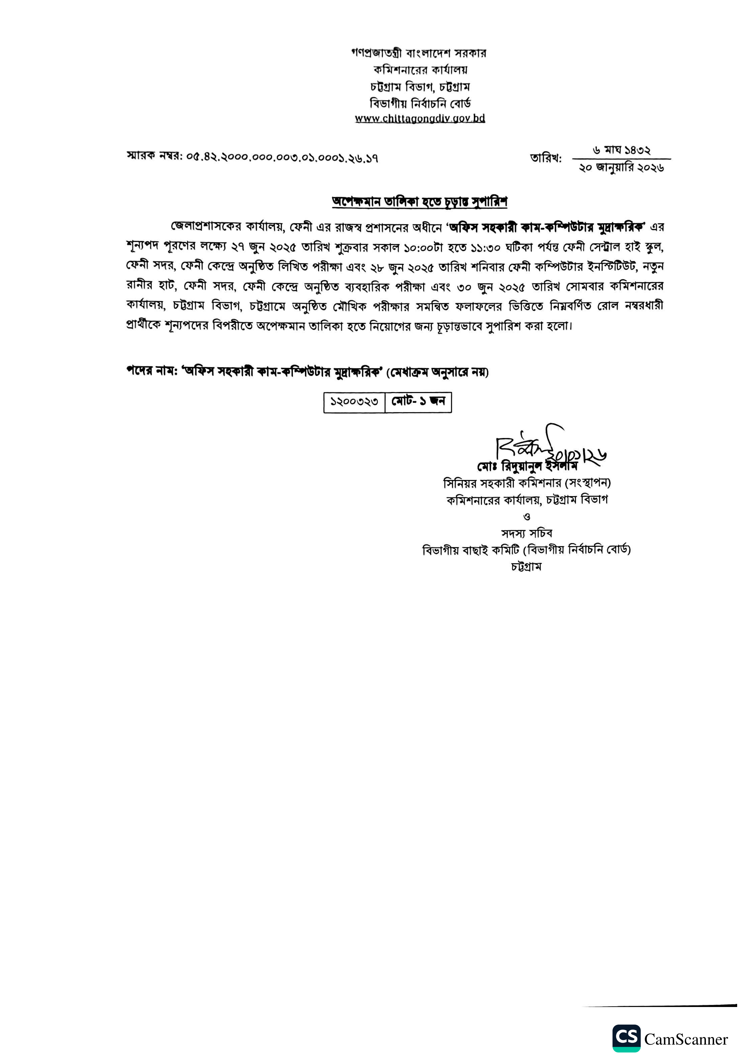 গণপ্রজাতন্ত্রী বাংলাদেশ সরকারের কমিশনারের কার্যালয়, চট্টগ্রাম বিভাগ কর্তৃক জেলাপ্রশাসকের কার্যালয়, ফেনী এর রাজস্ব প্রশাসনের অধীনে 'অফিস সহকারী কাম-কম্পিউটার মুদ্রাক্ষরিক' পদের শূন্যপদ পূরণের লক্ষ্যে অপেক্ষমান তালিকা হতে চূড়ান্ত সুপারিশ প্রকাশ করা হয়েছে।