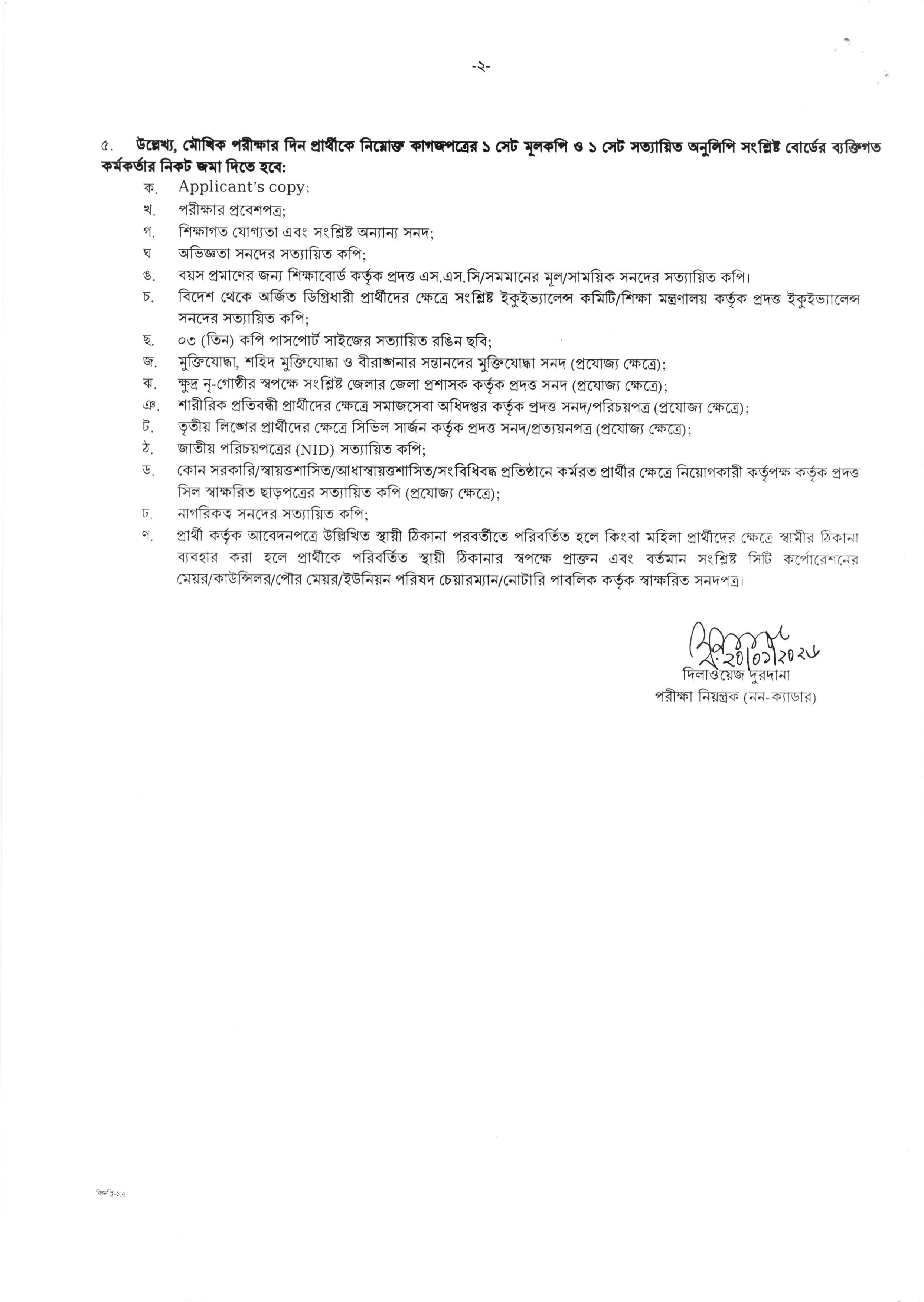 ২. মৌখিক পরীক্ষার দিন প্রার্থীর সকল শিক্ষাগত যোগ্যতার মূল সনদ, অভিজ্ঞতা সনদ (প্রযোজ্য ক্ষেত্রে), নাগরিকত্ব সনদ, জাতীয় পরিচয়পত্র এবং তিন কপি সত্যায়িত রঙিন ছবি সাথে আনতে হবে।