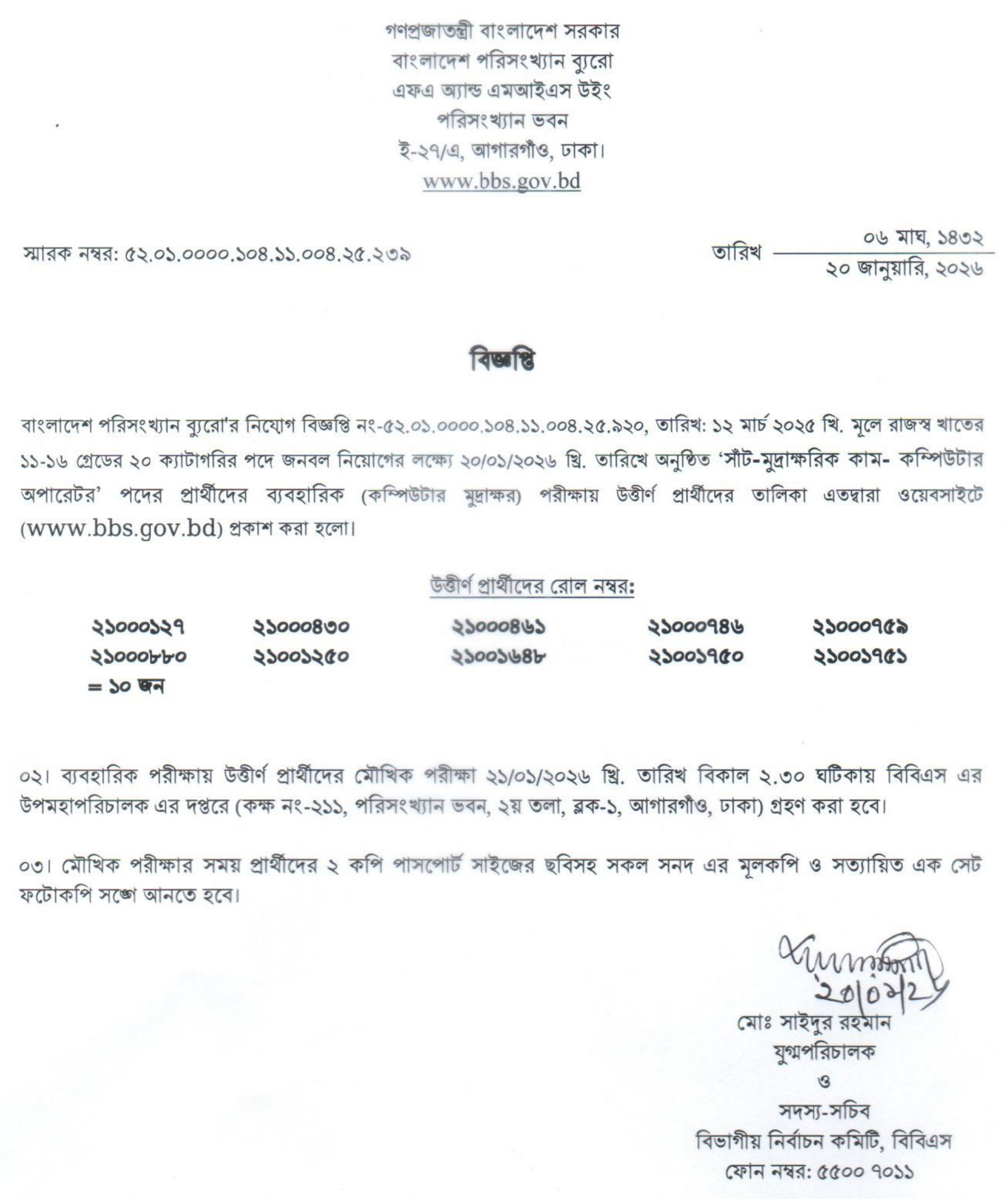 বাংলাদেশ পরিসংখ্যান ব্যুরো (BBS)-এর রাজস্ব খাতভুক্ত একটি পদের বিপরীতে অনুষ্ঠিত ব্যবহারিক (কম্পিউটার মুদ্রাক্ষর) পরীক্ষার ফলাফল প্রকাশিত হয়েছে। ব্যবহারিক পরীক্ষায় উত্তীর্ণ প্রার্থীদের পরবর্তী ধাপ হিসেবে মৌখিক পরীক্ষার জন্য ডাকা হয়েছে।