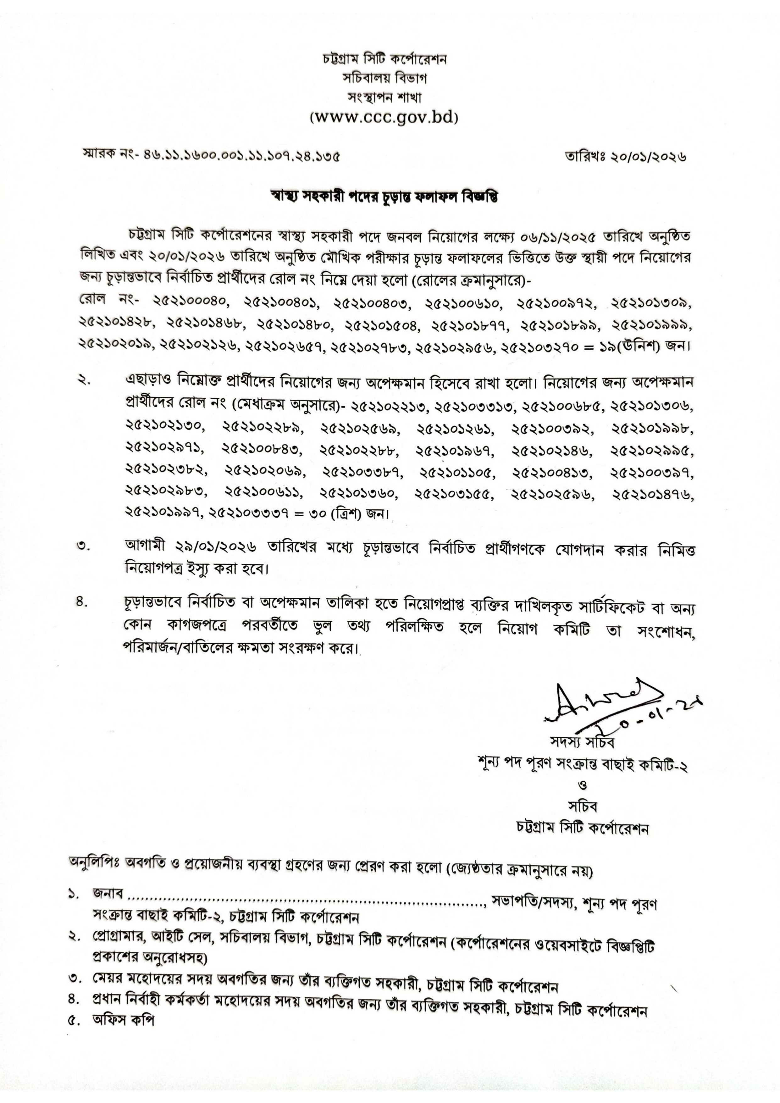 চূড়ান্তভাবে নির্বাচিত প্রার্থীদের আগামী ২৯/০১/২০২৬ তারিখের মধ্যে নিয়োগপত্র ইস্যু করা হবে এবং তাদের যোগদান করার জন্য বলা হয়েছে।