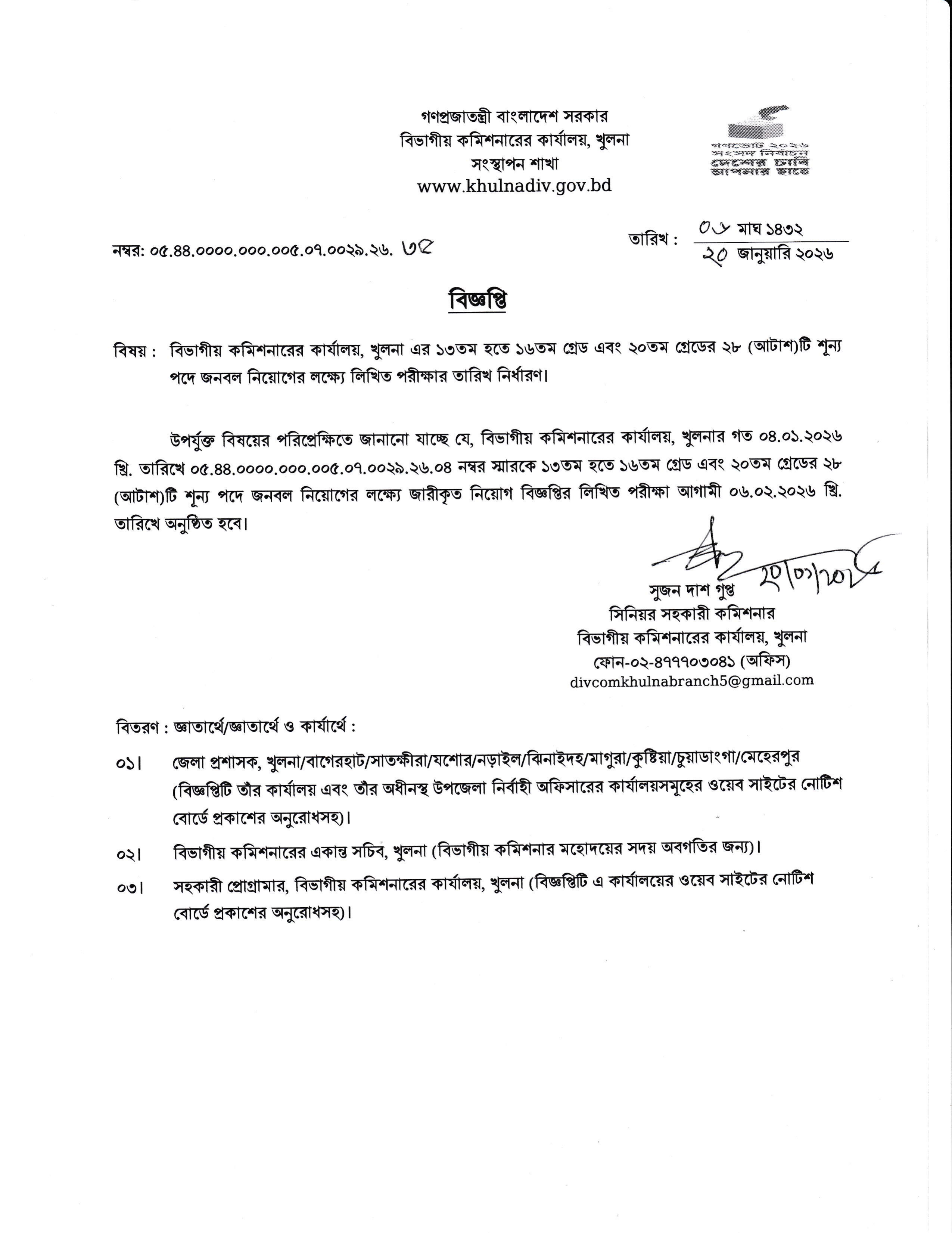 বিভাগীয় কমিশনারের কার্যালয়, খুলনা-এর ১৩তম হতে ১৬তম গ্রেড এবং ২০তম গ্রেডের বিভিন্ন পদে জনবল নিয়োগের লক্ষ্যে অনুষ্ঠিতব্য লিখিত পরীক্ষার সময়সূচী প্রকাশিত হয়েছে।