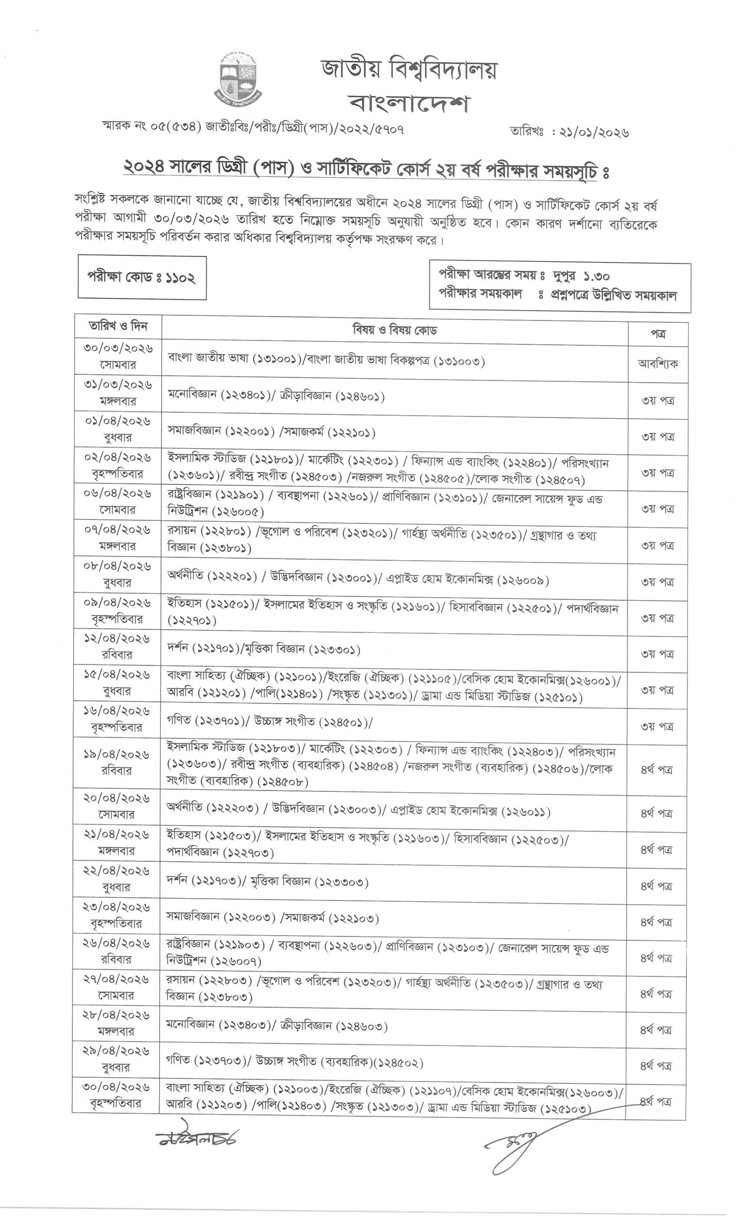 জাতীয় বিশ্ববিদ্যালয়ের অধীনে ২০২৪ সালের ডিগ্রী (পাস) ও সার্টিফিকেট কোর্স ২য় বর্ষ পরীক্ষার সময়সূচি প্রকাশ করা হয়েছে। বিজ্ঞপ্তি অনুযায়ী, আগামী ৩০ মার্চ ২০২৬ তারিখ থেকে এই পরীক্ষা শুরু হবে।