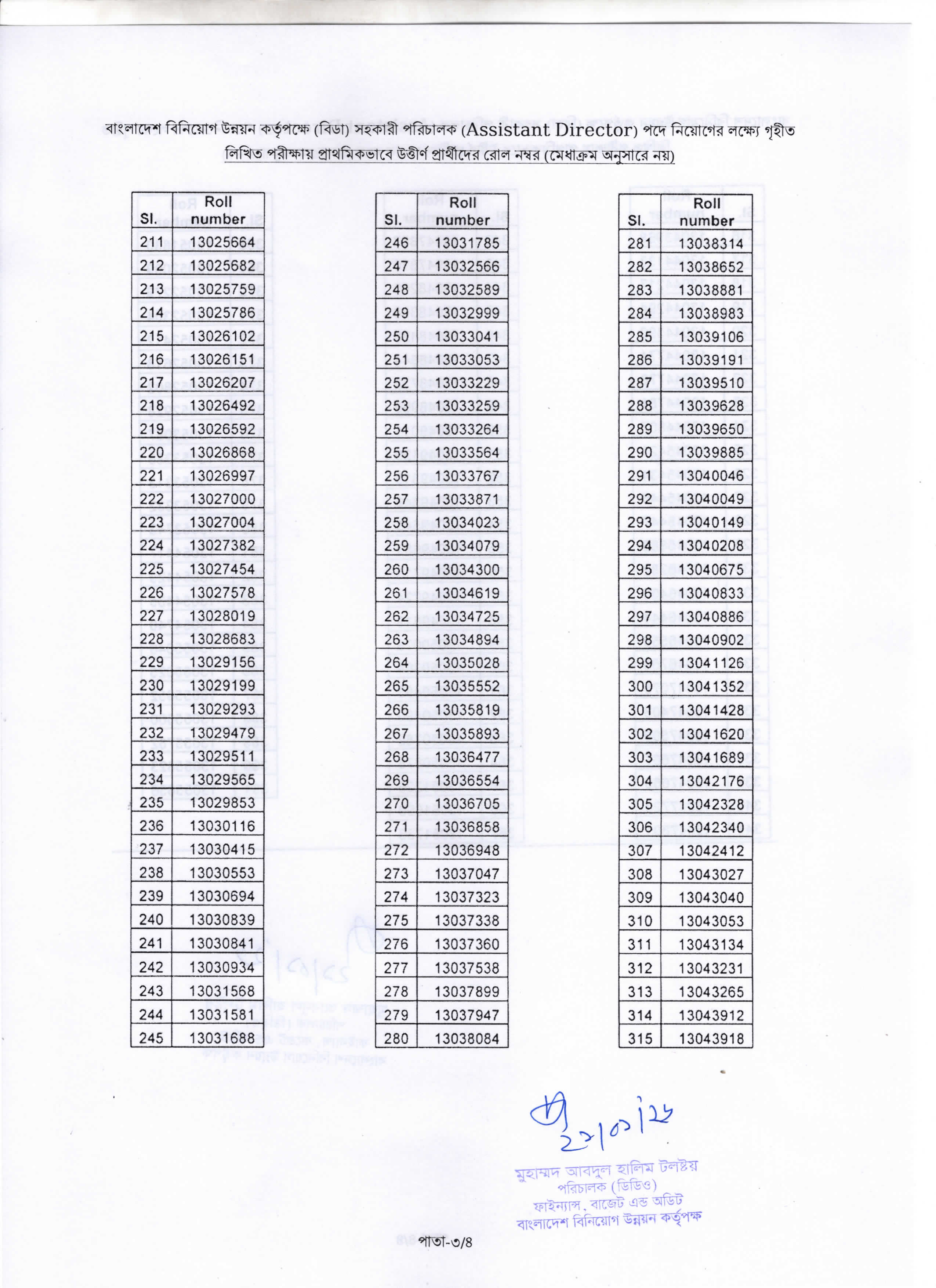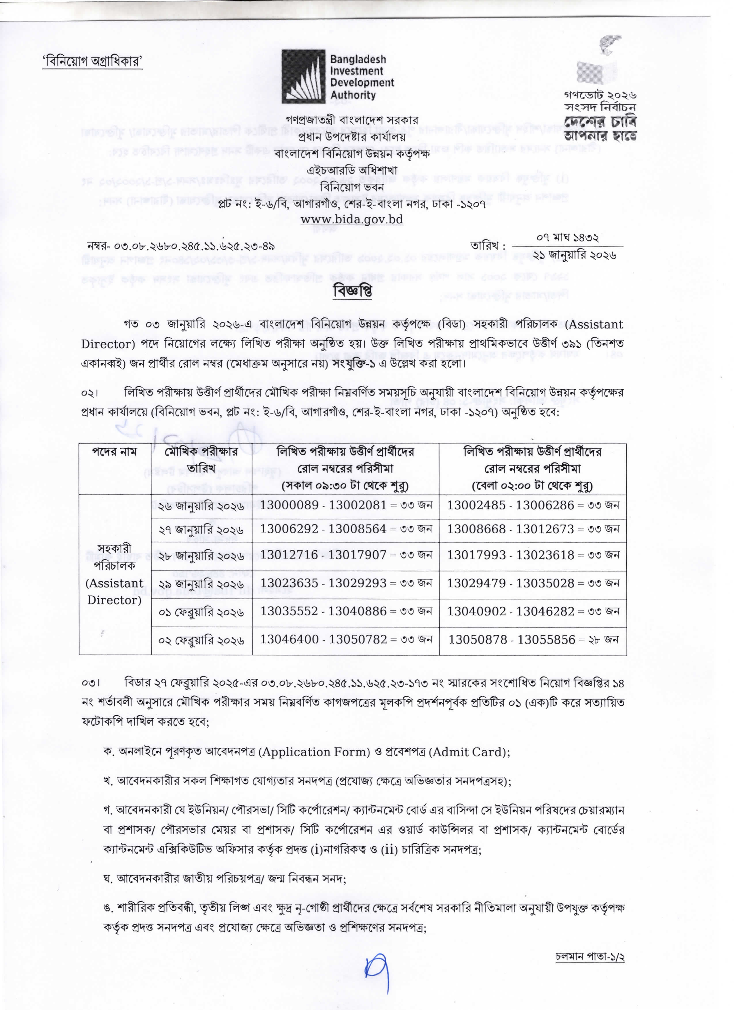 বাংলাদেশ বিনিয়োগ উন্নয়ন কর্তৃপক্ষ (বিডা) সহকারী পরিচালক পদের লিখিত পরীক্ষার ফলাফল এবং মৌখিক পরীক্ষার সময়সূচি প্রকাশ করেছে। গত ৩ জানুয়ারি ২০২৬ তারিখে অনুষ্ঠিত লিখিত পরীক্ষায় উত্তীর্ণ প্রার্থীদের তালিকা এবং পরবর্তী ধাপের মৌখিক পরীক্ষার নির্দেশনাবলী প্রদান করা হয়েছে।