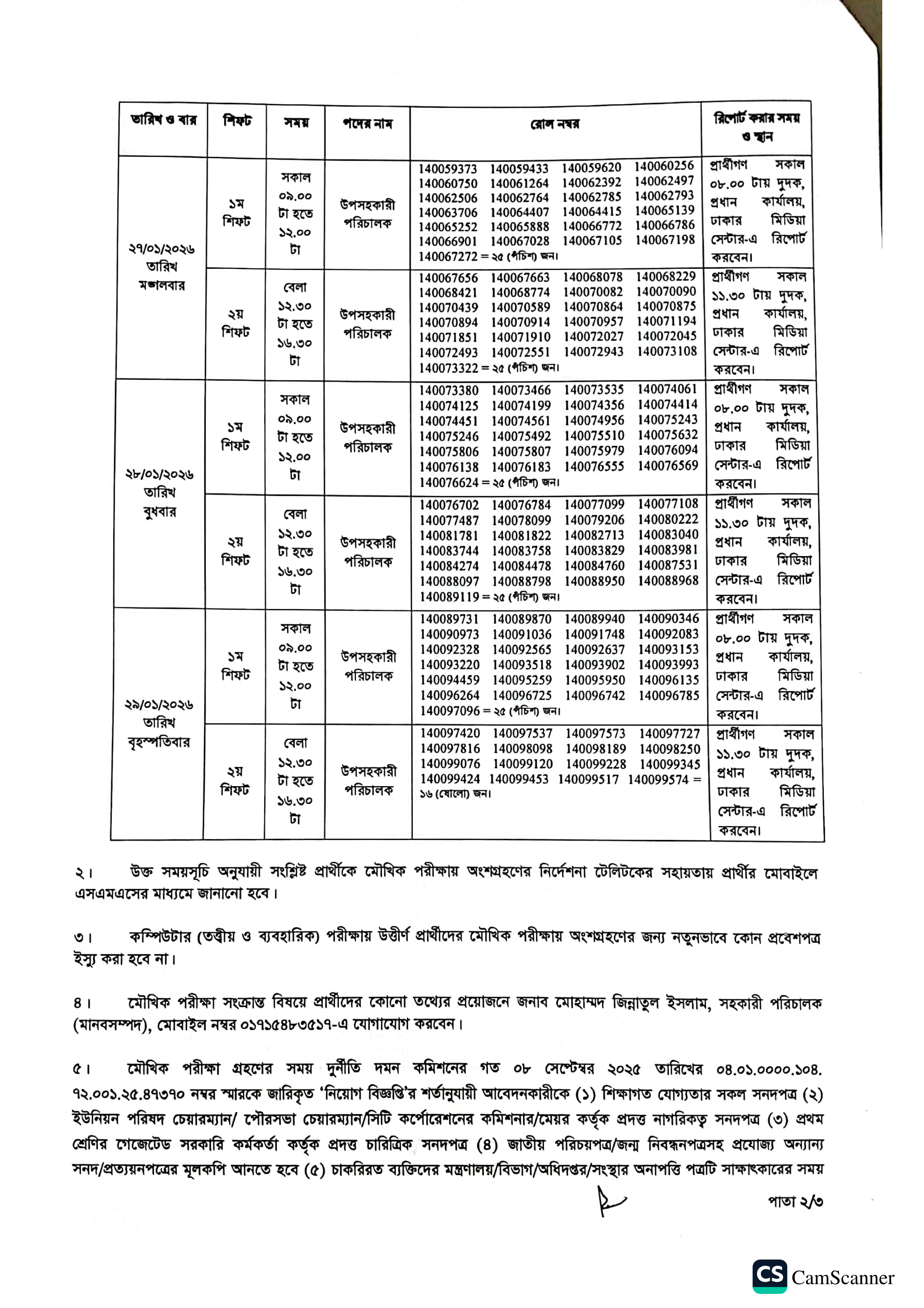 প্রার্থীদের মোবাইলে এসএমএসের মাধ্যমে পরীক্ষার সময়সূচি জানানো হবে এবং মৌখিক পরীক্ষার জন্য নতুন কোনো প্রবেশপত্র ইস্যু করা হবে না।