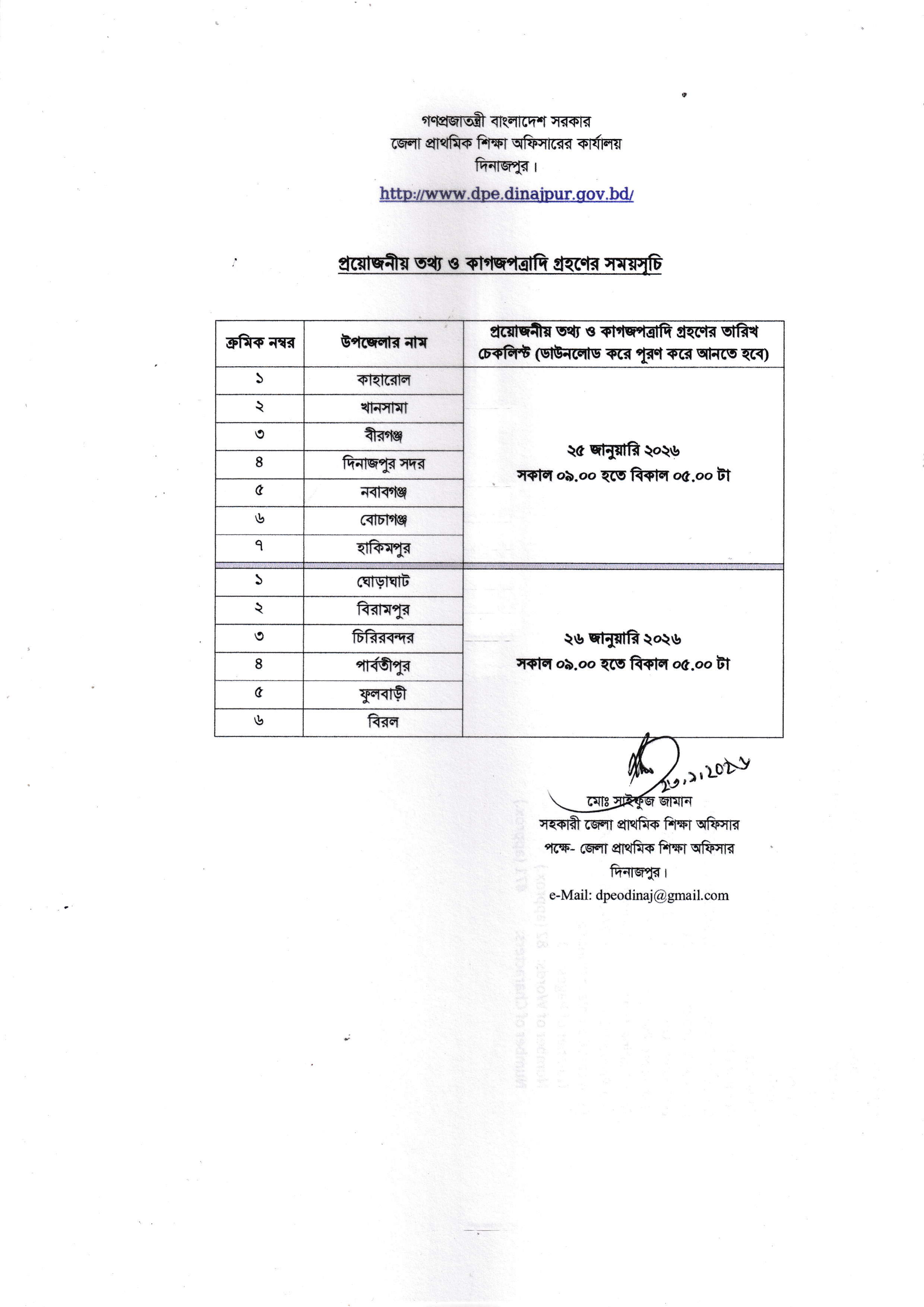 গণপ্রজাতন্ত্রী বাংলাদেশ সরকার, দিনাজপুর কর্তৃক প্রয়োজনীয় তথ্য ও কাগজপত্রাদি গ্রহণের সময়সূচি প্রকাশ করা হয়েছে। আগ্রহী ব্যক্তিগণ নির্ধারিত সময়সূচি অনুযায়ী তাদের কাগজপত্র জমা দিতে পারবেন।