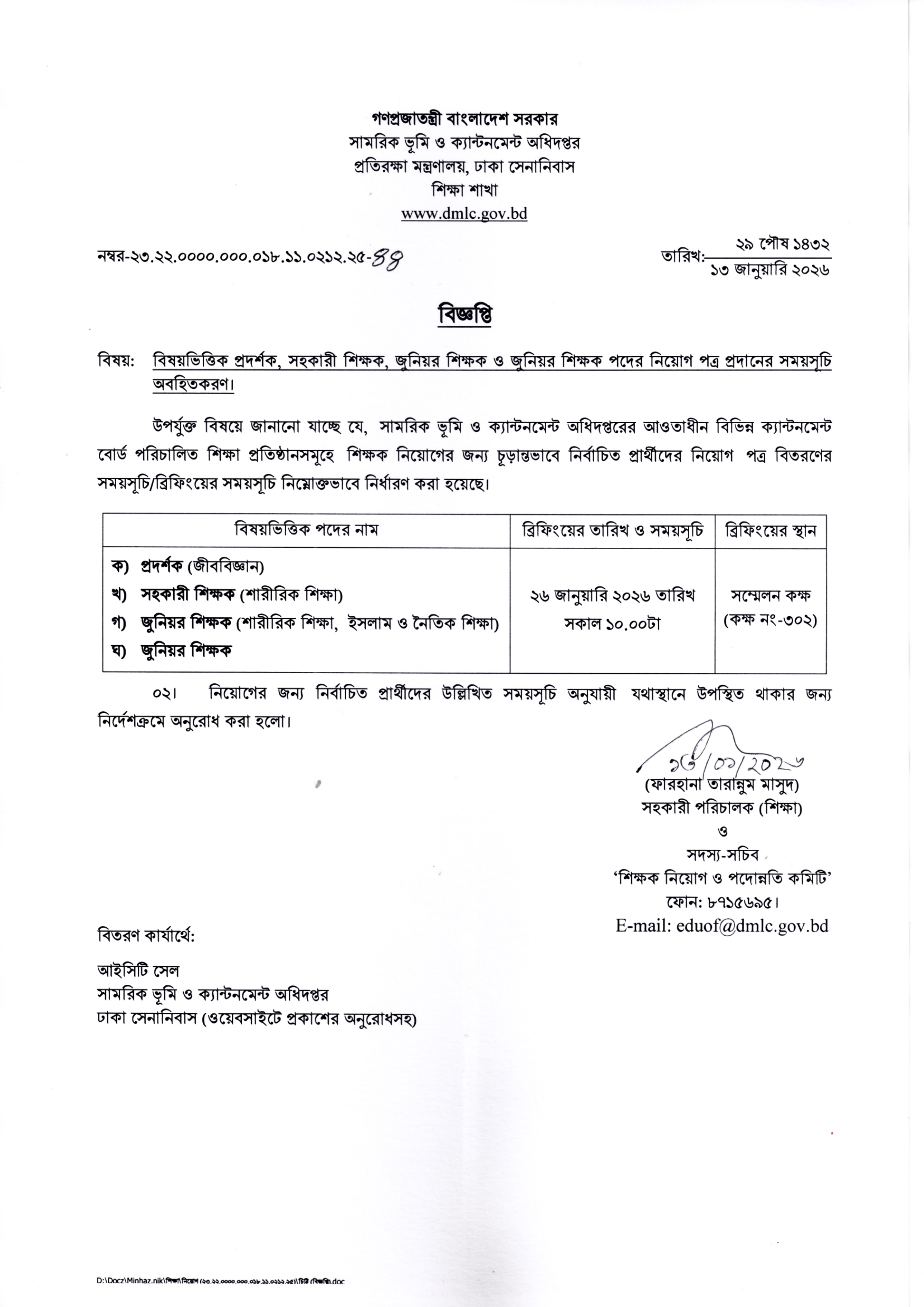 নিয়োগের জন্য নির্বাচিত প্রার্থীদের ২৬ জানুয়ারি ২০২৬ তারিখ, সকাল ১০.০০টায় সামরিক ভূমি ও ক্যান্টনমেন্ট অধিদপ্তরের সম্মেলন কক্ষে (কক্ষ নং-৩০২) উপস্থিত থাকার জন্য নির্দেশক্রমে অনুরোধ করা হয়েছে।