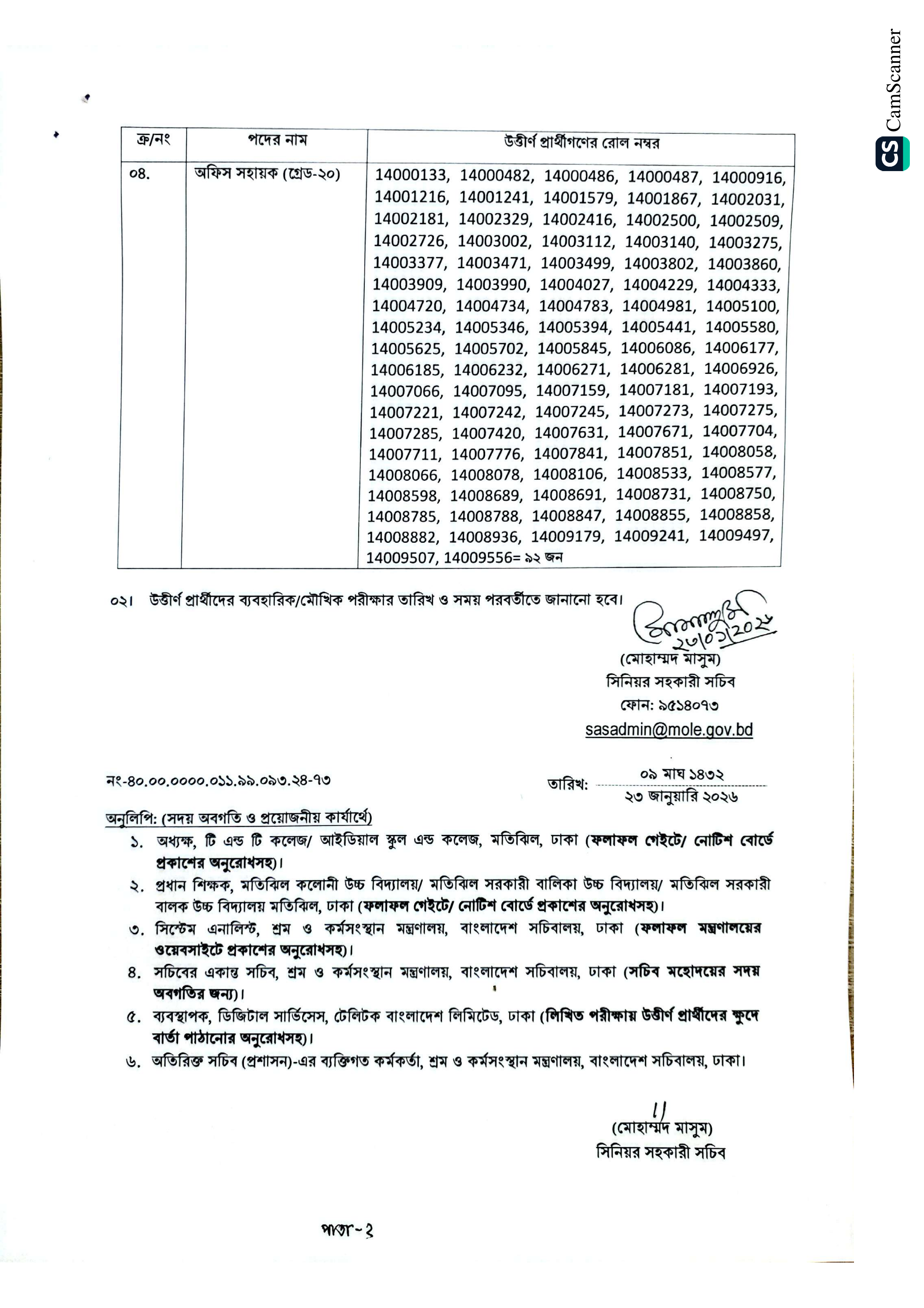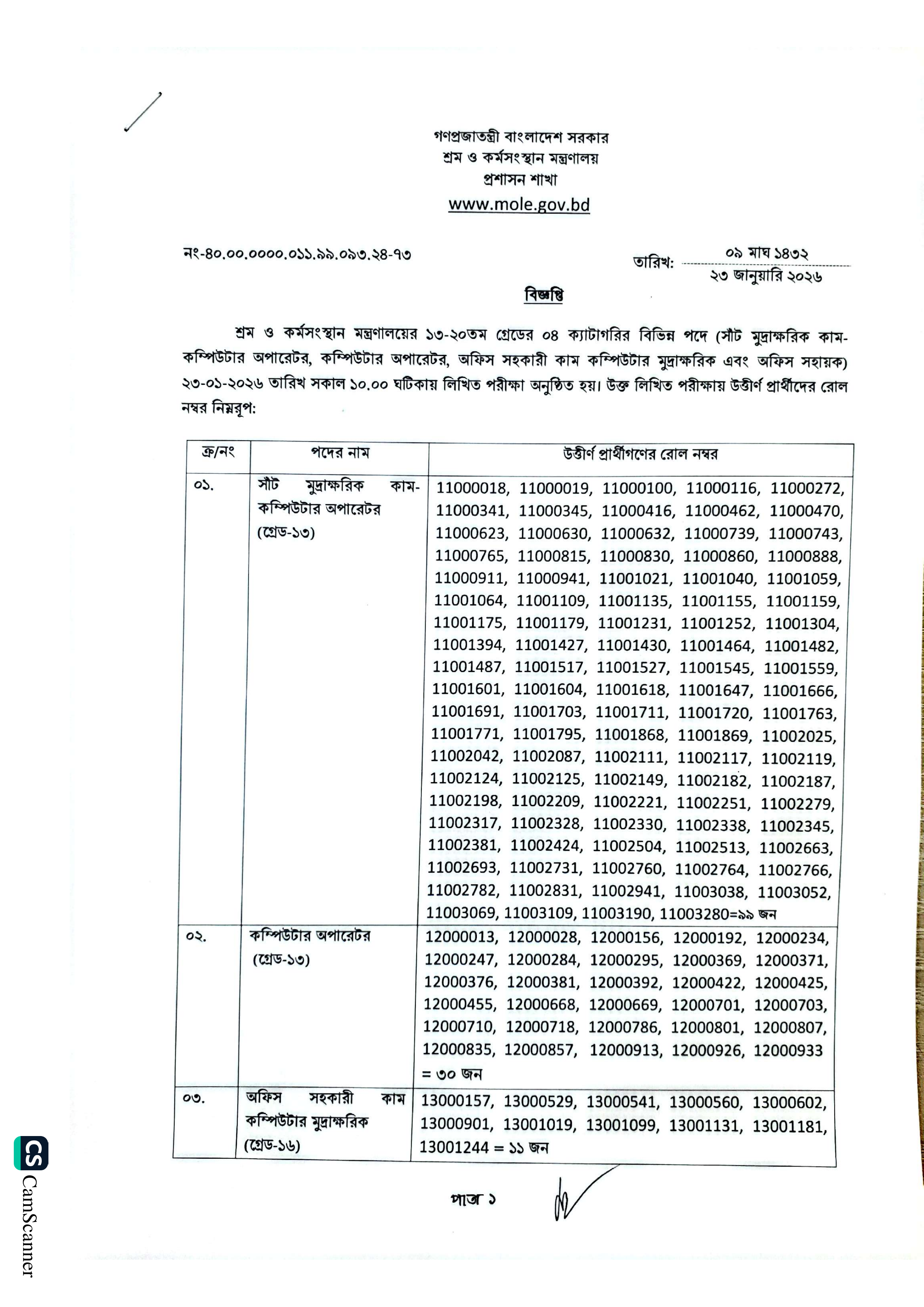 শ্রম ও কর্মসংস্থান মন্ত্রণালয়ের ১৩-২০তম গ্রেডের ০৪টি ক্যাটাগরির বিভিন্ন পদের লিখিত পরীক্ষার ফলাফল প্রকাশিত হয়েছে। গত ২৩ জানুয়ারি ২০২৬ তারিখে অনুষ্ঠিত লিখিত পরীক্ষায় উত্তীর্ণ প্রার্থীদের তালিকা প্রকাশ করা হয়েছে।