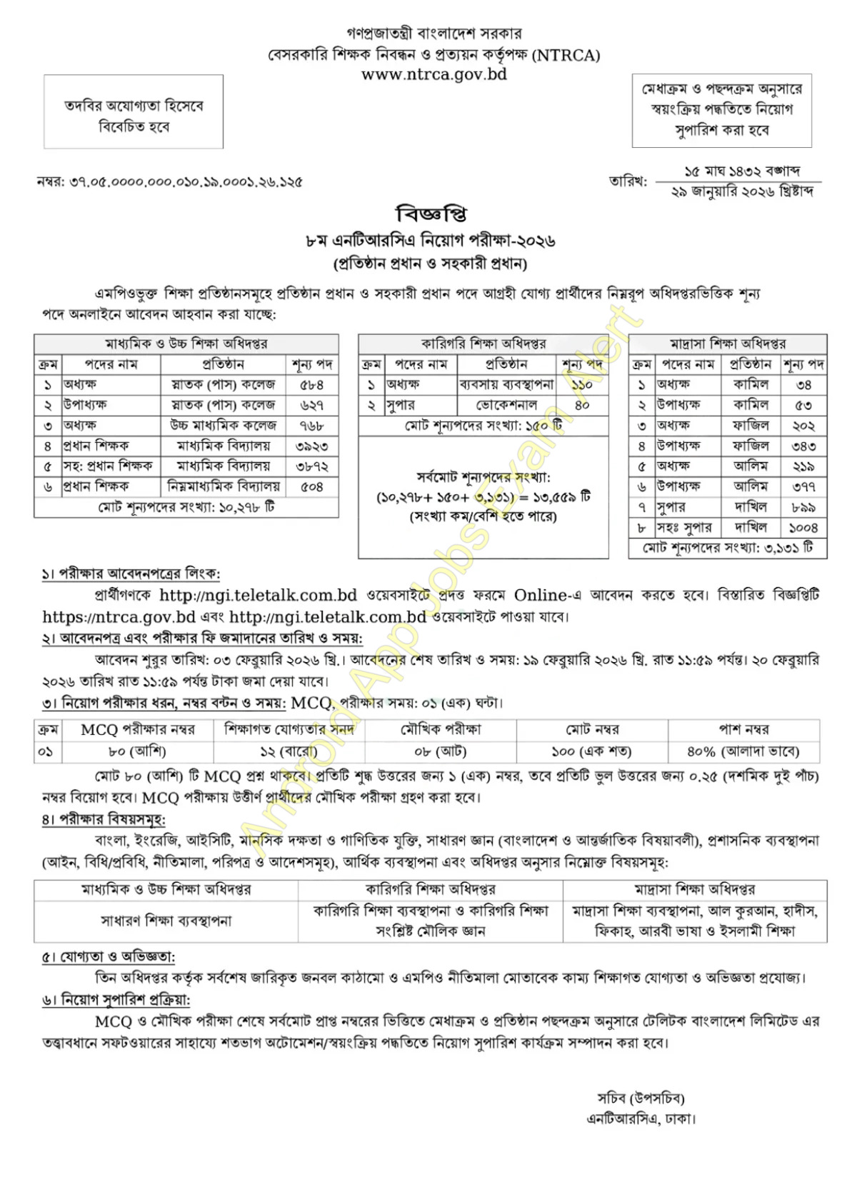 বেসরকারি শিক্ষক নিবন্ধন ও প্রত্যয়ন কর্তৃপক্ষ (NTRCA Job Circular 2026) বেসরকারি শিক্ষা প্রতিষ্ঠানসমূহে (স্কুল, কলেজ, মাদ্রাসা ও কারিগরি) প্রতিষ্ঠান প্রধান ও সহকারী প্রধান পদে নিয়োগের জন্য ‘৮ম এনটিআরসিএ বিজ্ঞপ্তি-২০২৬’ প্রকাশ করেছে। এই বিজ্ঞপ্তির মাধ্যমে মোট ১৩,৫৯৯টি শূন্য পদে নিয়োগ সুপারিশ করা হবে।