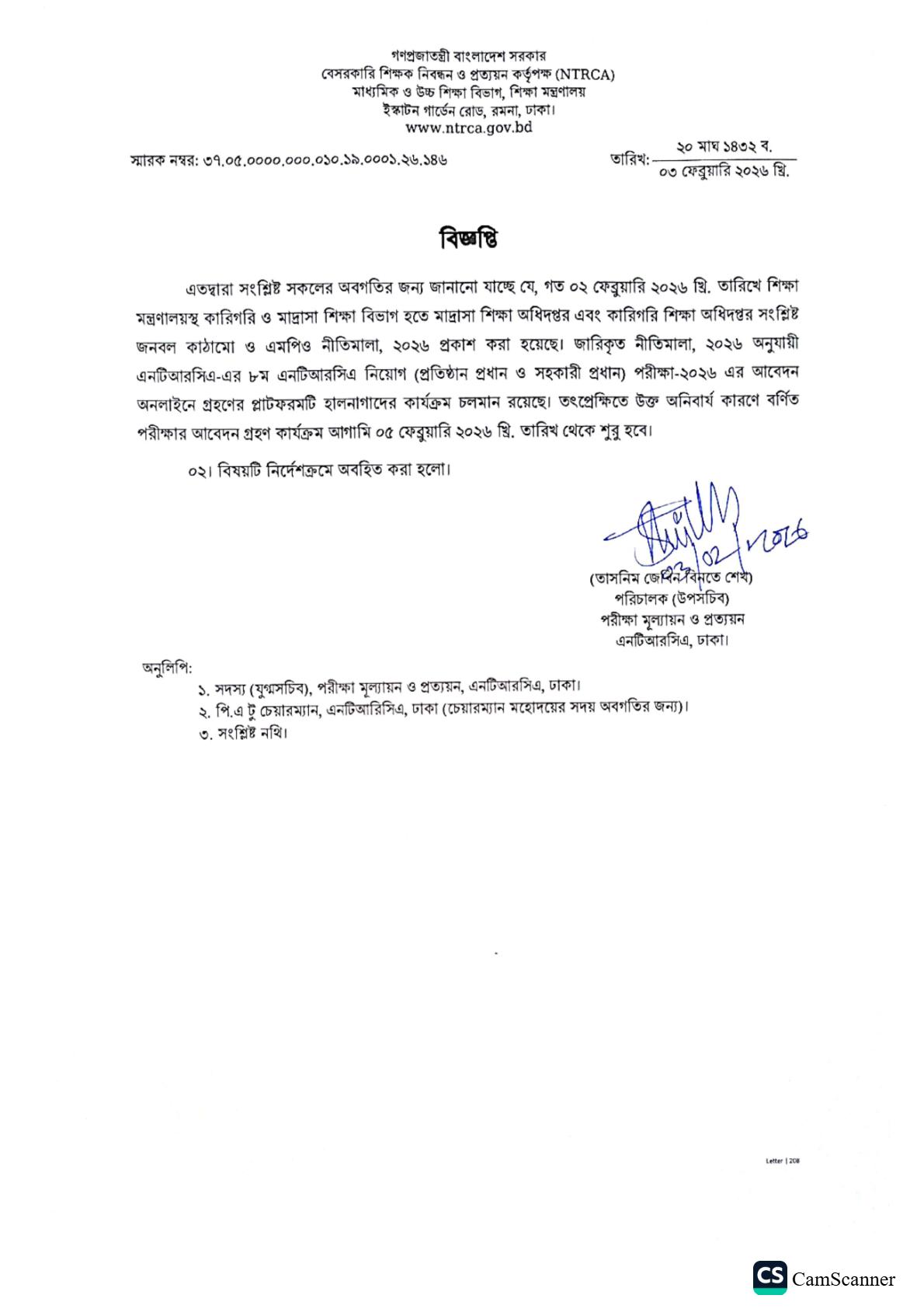 - কর্তৃপক্ষ: বেসরকারি শিক্ষক নিবন্ধন ও প্রত্যয়ন কর্তৃপক্ষ (NTRCA)